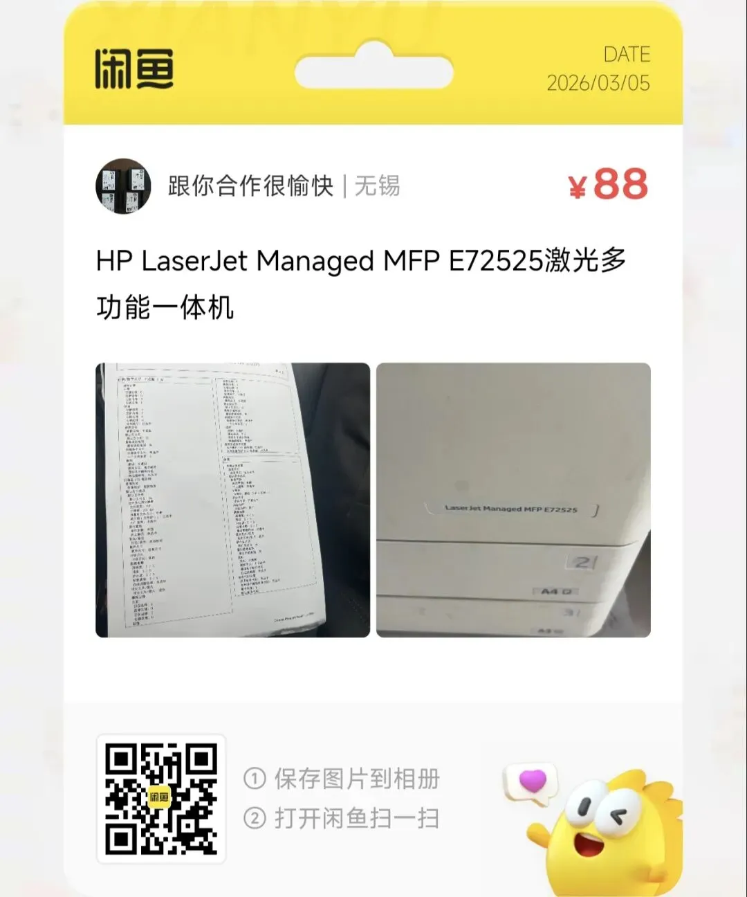 粉丝爆料分享了一台价格88元的HP LaserJet Managed MFP E72525激光多功能一体机