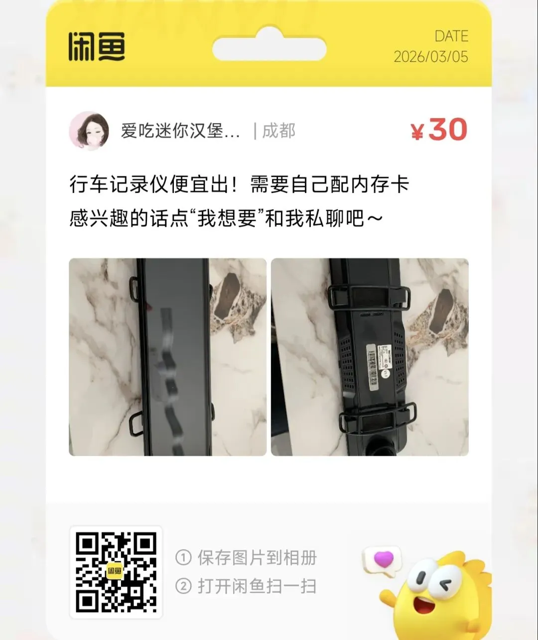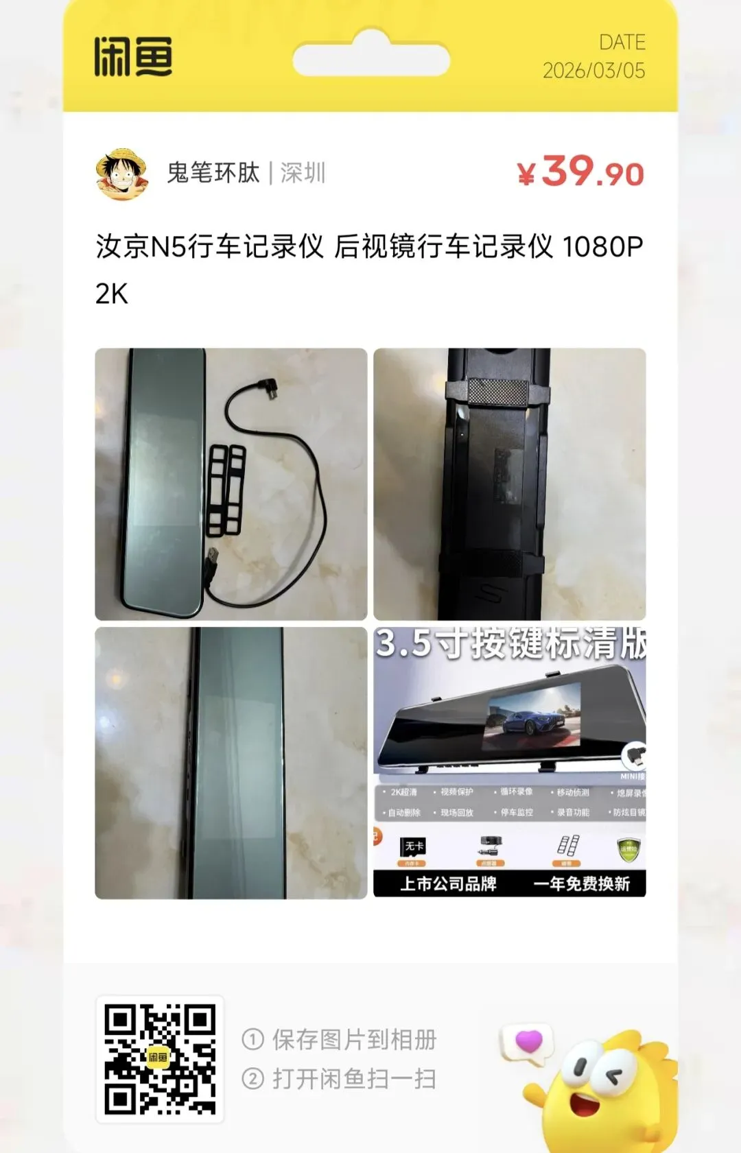 粉丝爆料分享了一台价格39元的汝京N5行车记录仪 后视镜行车记录仪 1080P 2K几乎全新的行车记录仪