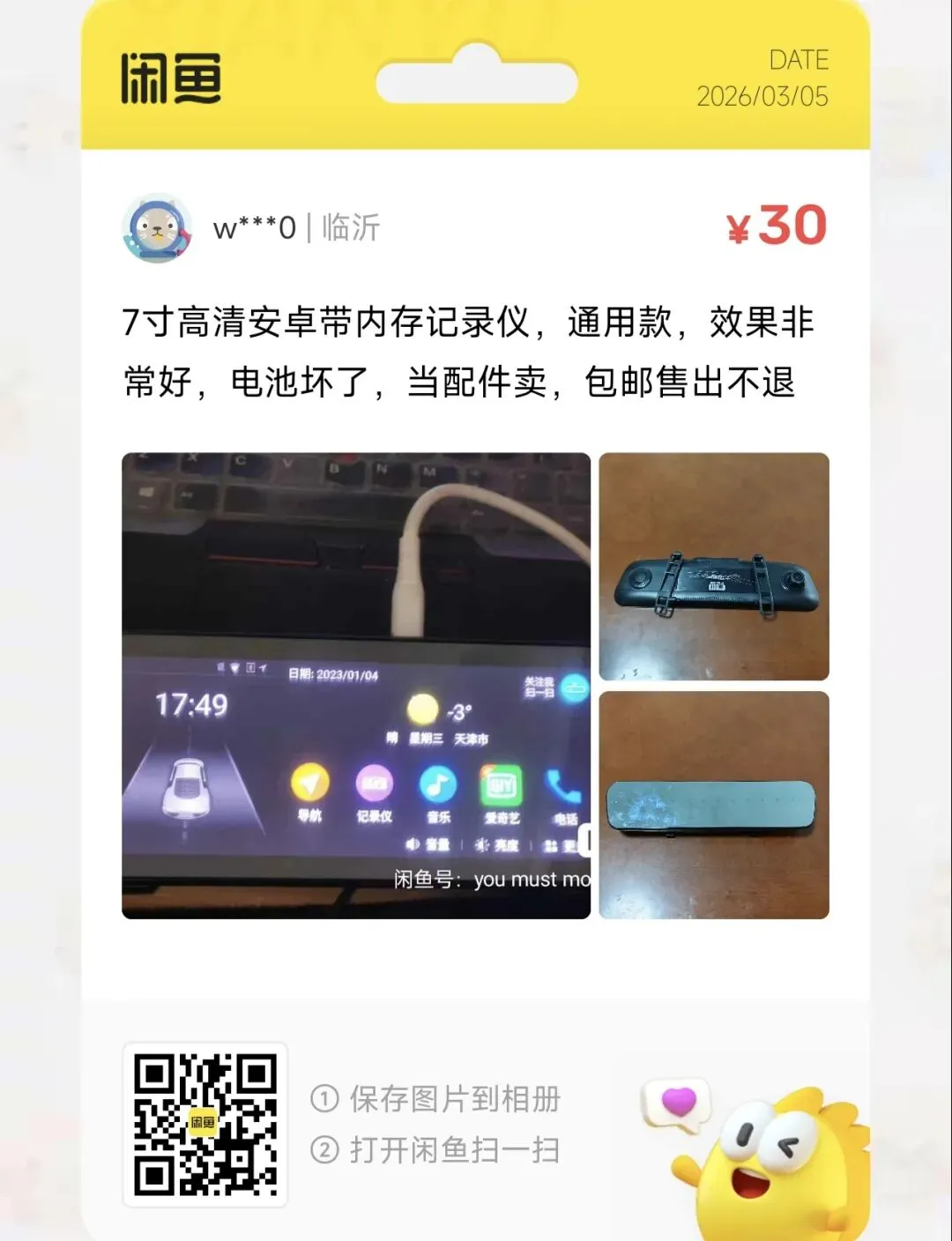 粉丝爆料分享了一台价格30元包邮的7寸高清安卓带内存记录仪,通用款,效果非常好,电池坏了,当配件卖,包邮售出不退
