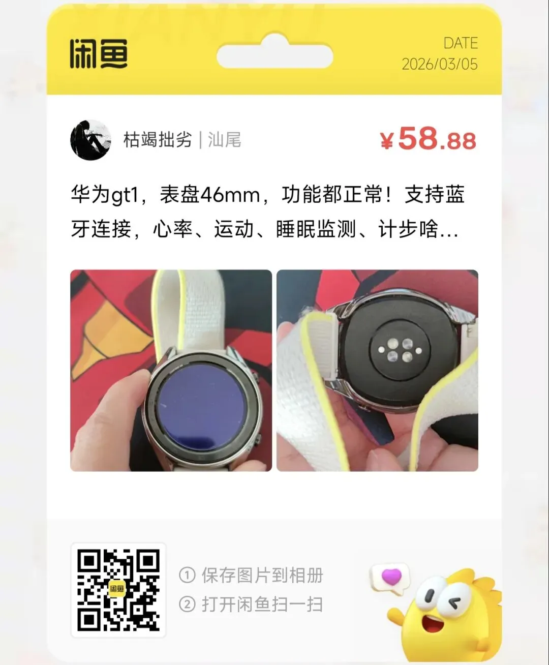 粉丝爆料分享了一台价格58元的华为gt1,表盘46mm,功能都正常