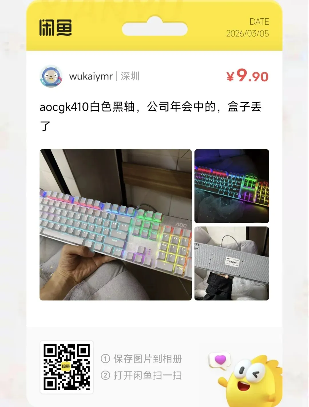 粉丝爆料分享了一台价格9.9元的aocgk410白色黑轴,公司年会中的,盒子丢了