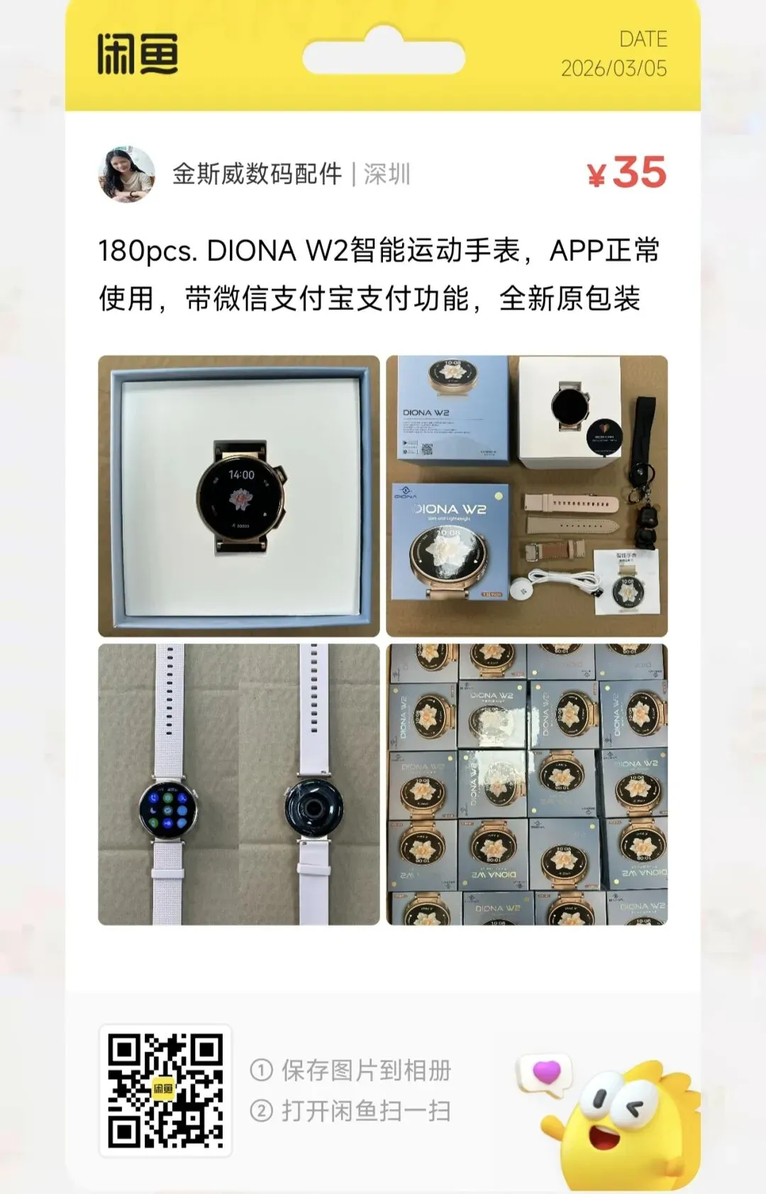 粉丝爆料分享了一款价格35元的DIONA W2智能运动手表,卖家有180个。APP正常使用,带微信支付宝支付功能,全新原包装。