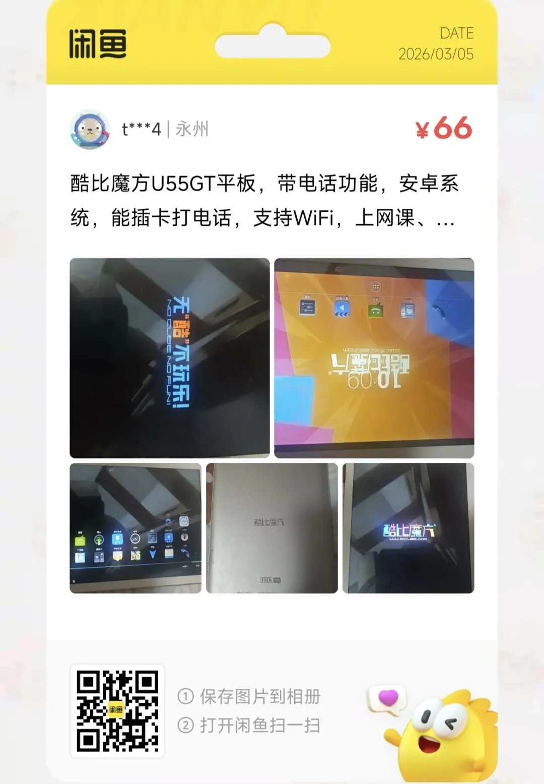 粉丝爆料分享了一台价格66元包邮的酷比魔方U55GT平板,带电话功能,安卓系统,能插卡打电话,支持WiFi