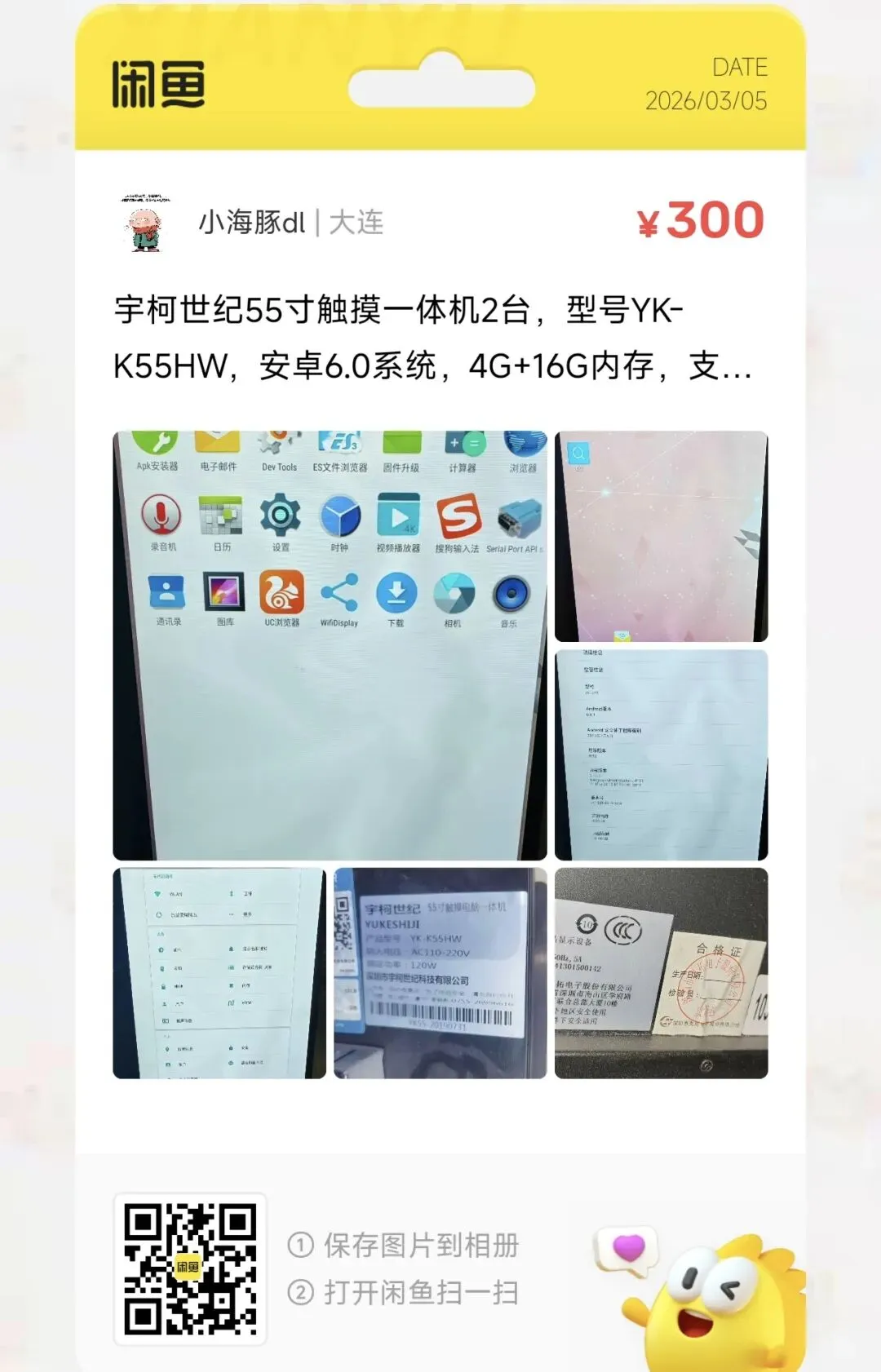 粉丝爆料分享了一款价格300元的宇柯世纪55寸触摸一体机2台,型号YK-K55HW,安卓6.0系统,4G+16G内存,支持横竖屏切换