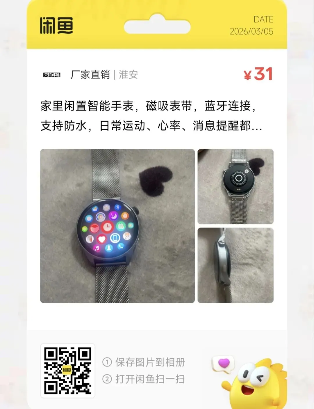 粉丝爆料分享了一台价格31元的闲置智能手表,磁吸表带,蓝牙连接,支持防水,日常运动、心率、消息提醒都能用,功能正常