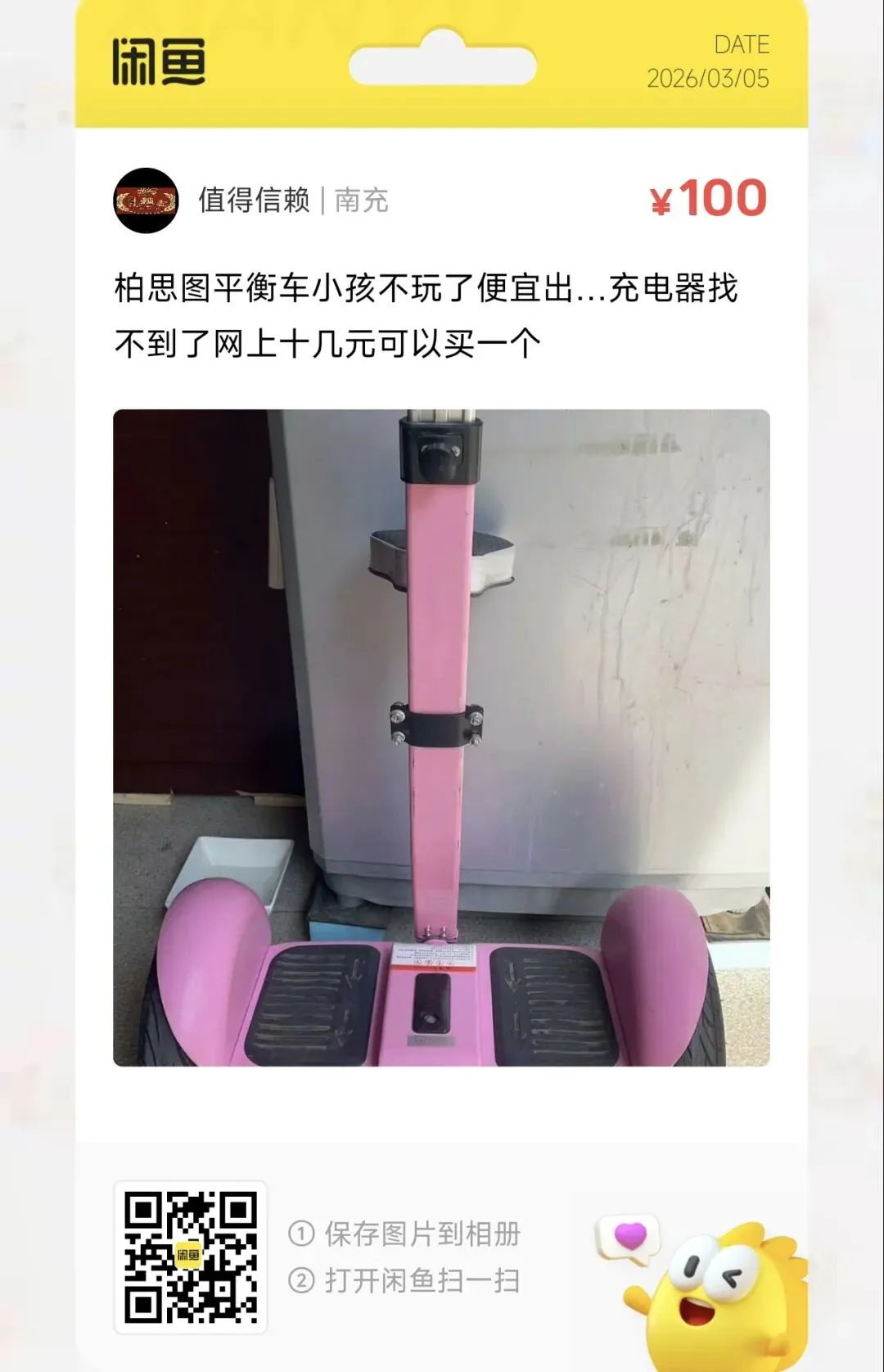 粉丝爆料分享了一台价格100元的电动平衡车,可跟随。