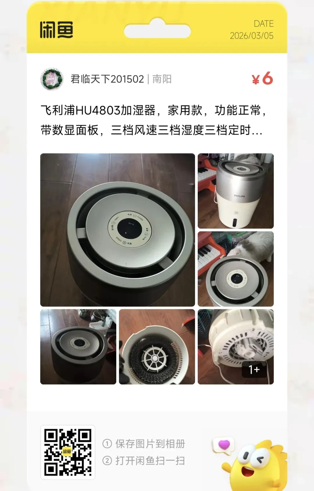 粉丝爆料分享了一台价格6元的飞利浦HU4803加湿器,家用款,功能正常