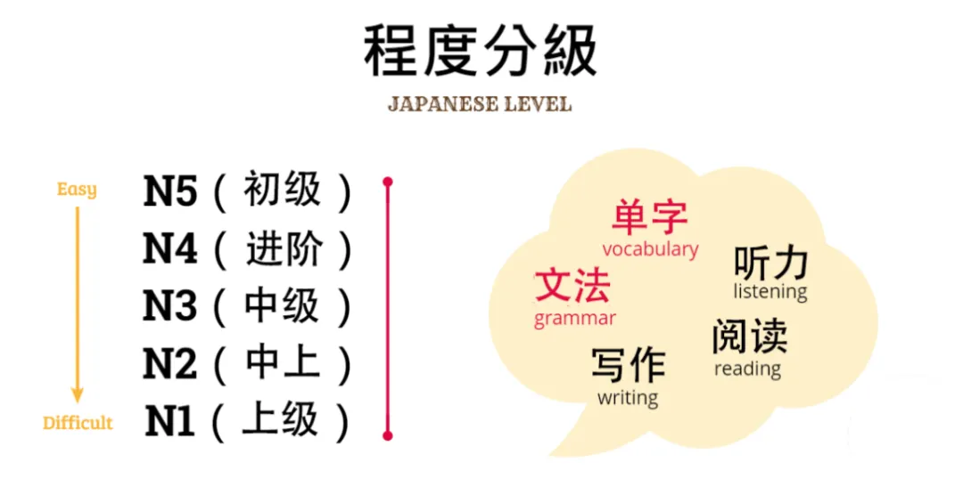JLPT 依照程度不同共分为五级,最初级为N5,最高级为N1。可自由报考级别,一般而言,较少人参加N5考试,能端出台面上的最差也要N3(如果是专业领域需N1,最差也要N2以上),基本上N5跟N4没有什麽实质功能。因此即使是初级者也多会选择直接考N4作为初级毕业的证明。但若只是自我验收实力,也是可以参加N5测验的,只是有点伤荷包就是了。