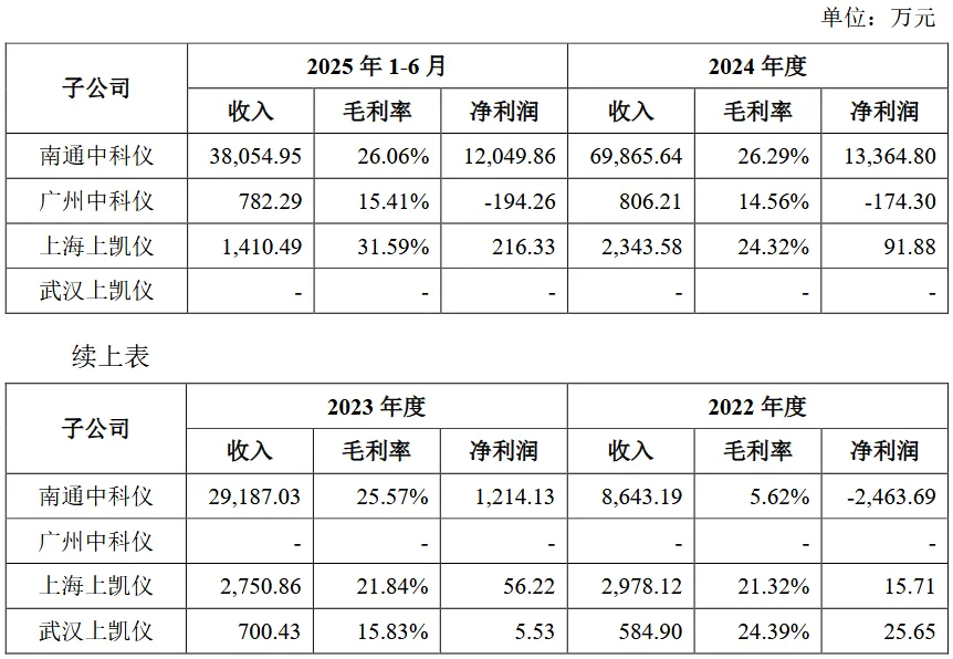 南通中科仪的生产基地于 2022 年建成后投产,因投产当年相关产品收入较小、规模效应尚未显现,产品单位固定成本相对较高,因此毛利率相对较低,净利润为负。2023 年起,南通中科仪收入规模大幅上升,此后各期毛利率相对稳定,各期净利润均为正。上海上凯仪、武汉上凯仪与广州中科仪整体规模较小,收入及净利润金额均较低,该等子公司主要收入来源系维修维护收入,各期收入增幅较为平稳,不存在异常变动。