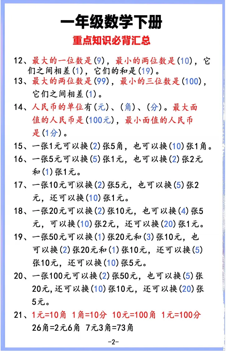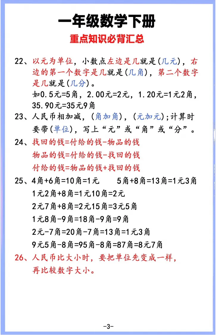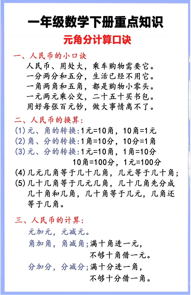 一年级数学学习必备!这份资料涵盖人民币换算、加减公式、数位认知、图形辨认等核心知识点,搭配换算口诀和例题解析,同步课本进度。打印出来让孩子每天记一点,家长辅导有抓手,轻松搞定元角分、加减法等难点,夯实数学基础~