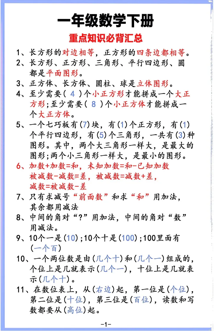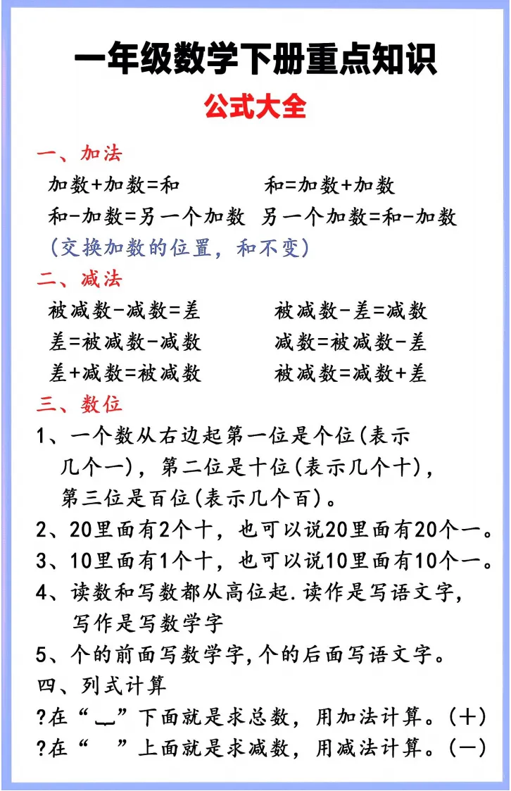一年级数学|下册重点知识汇总 可打印背诵