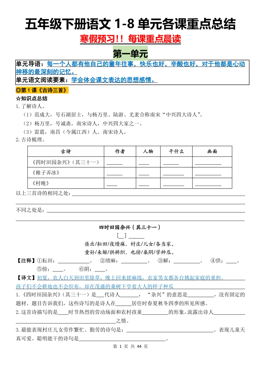 大家好,我是小敏妈妈,今天为大家分享的是;【2026春】人教部编版五年级下册语文《全册课文重点知识点汇总》含答案,高清电子版可打印