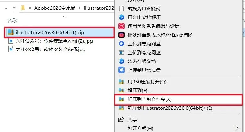 1、下载Illustrator2026软件安装包到电脑上,右键选择【解压到当前文件夹】。