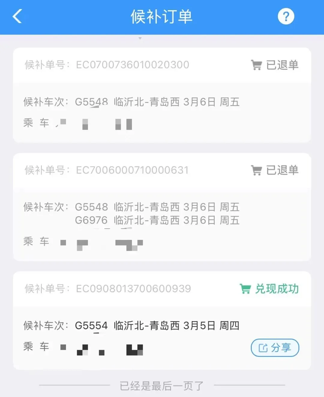 我再购买今天车票时,一等座、二等座和无座的都已经售罄了,1个小时车程实在不想花那么高的价格买商务座。于是我就开始候补车票的申请,因为纠结出发时间以及班次问题加上买错票导致有点儿慌张,我反反复复操作了3次,最后只提交了一个班次的申请,提交申请时系统提醒我成功率60%。我后来不放心,又用女儿的账号把剩余的班次全部选上了提交了一个候补申请单,提示成功率80%。昨天下午快到5点的时候我们的候补都没成功,我又有点儿着急,纠结了半天就买下午很晚一个班次的无座票(站票)。买完后我把自己的候补订单取消了,女儿在外面暂时没有取消,然后等到晚上7点时候她告诉我候补车票成功了,是早上7:25的……我真是又高兴又心疼还要损失票面价值的20%手续费了🥲就这样,昨天我就在买票退票上折腾了一天,交了60块钱的手续费😅好在现在已经在返程的车上了。