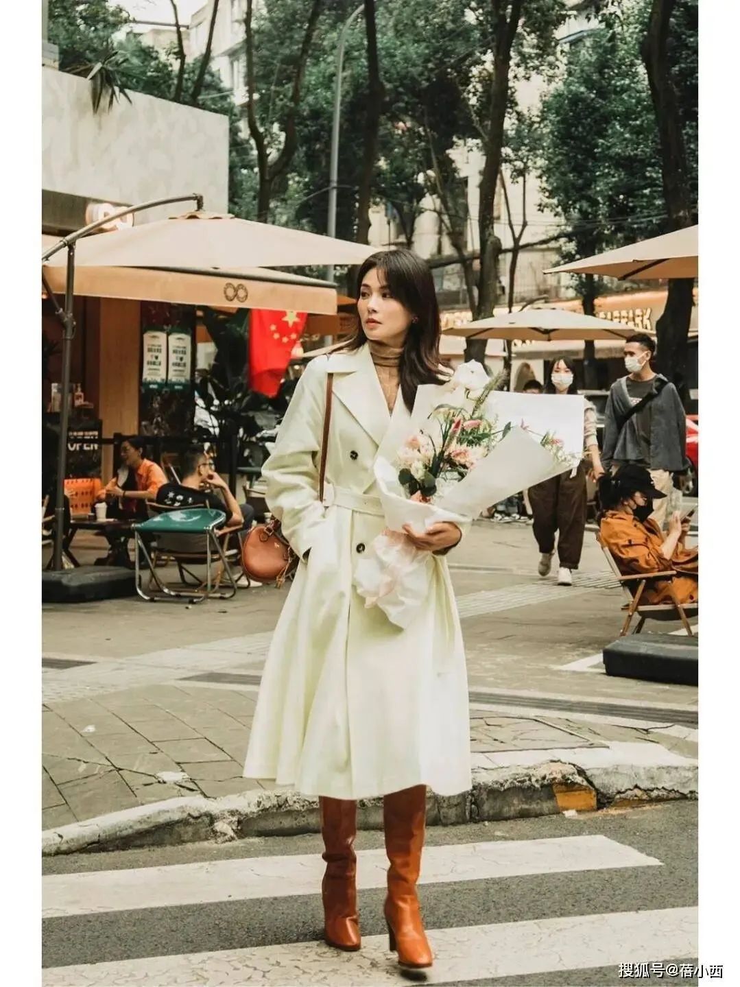 风衣里边是浅卡其色的高领针织衫,领口露出了一截,和外面风衣的颜色特别搭,很有层次感,进而避免了单调。棕色包包看着不错,肩带比较细,挎在肩上十分洋气。此外,棕色包包具有百搭特点,浅色、深色外套都能与之组合。脚上穿了一双焦糖色高筒靴,由于风衣的衣摆在小腿肚位置,所以靴筒的高度不好确定。靴子选择的材质具有一定光泽感,不是哑光的,因此在光线下会有点亮。