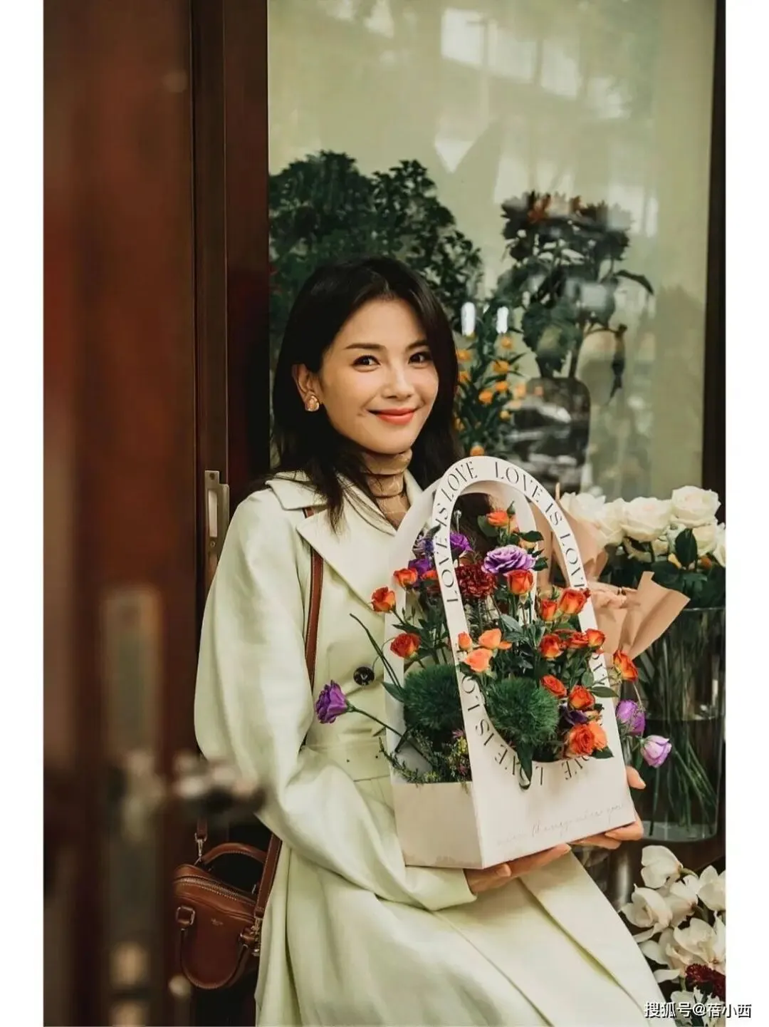 身上这款风衣颜色不一般,是那种浅米黄色,不是死白也不是很扎眼的亮黄,看上去给人温柔感。风衣融入了经典的双排扣设计,扣子颜色挺深,与浅色衣身形成对比。最妙的是腰间那条同色系腰带,刚好系在腰线最细的地方,一下子优化了身材比例。腰带的存在还有一个好处,就是不会让宽松版型的风衣像个大袍子一样显得臃肿。风衣长度到小腿肚那里,加上衣服松量多,所以有穿裙子的感觉。
