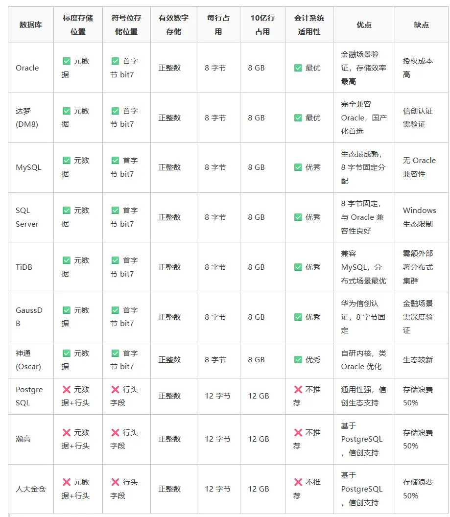 | 人大金仓 | ❌ 元数据+行头 | ❌ 行头字段 | 正整数 | 12 字节 | 12 GB | ❌ 不推荐 | 基于 PostgreSQL,信创支持 | 存储浪费 50% |