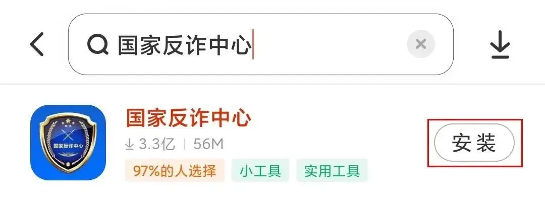 1、打开手机上的应用商城,在搜索栏输入“国家反诈中心”,然后搜索,在下面的条目中,选择安装;或者扫描下图二维码下载安装。