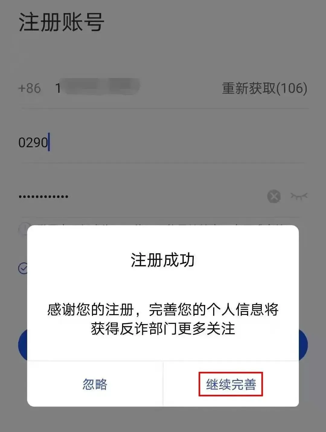 5、填写个人手机号、验证码,设置个人密码,并点击继续完善按钮。