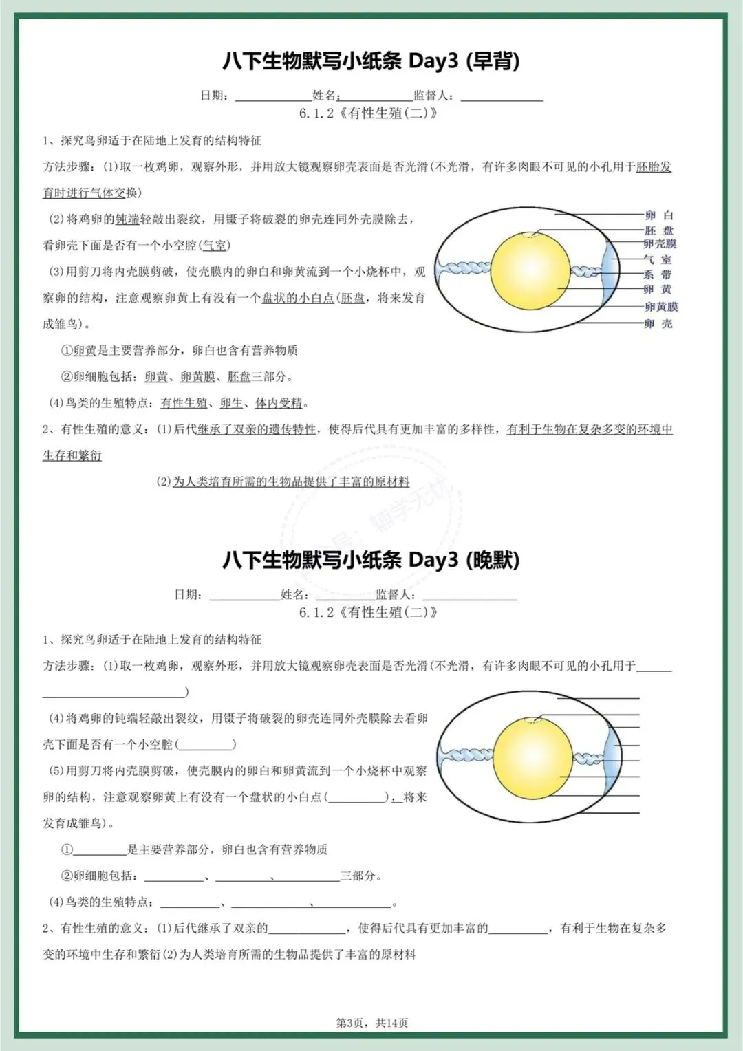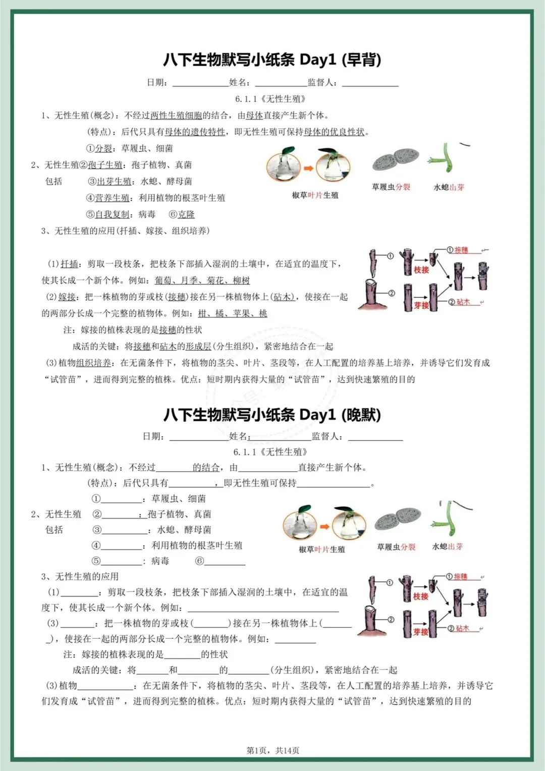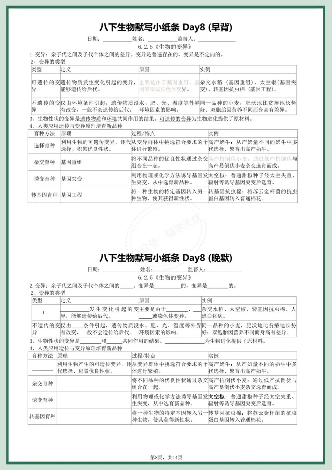 八下生物|2026年春季最新版八年级下册生物每日晨背晚默小纸条,打牢基础必备!完整可打印!