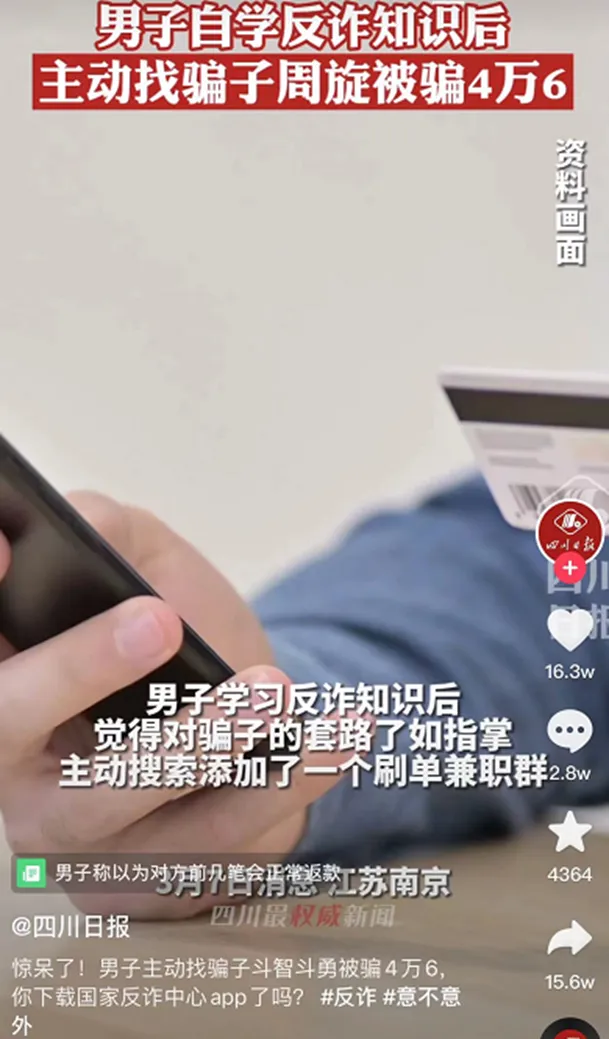 一位男子在学在习反诈知识后,自觉对套路“了如指掌”,可以玩弄骗子于股掌之间,于是乎主动找上骗子,想要秀一波智商。