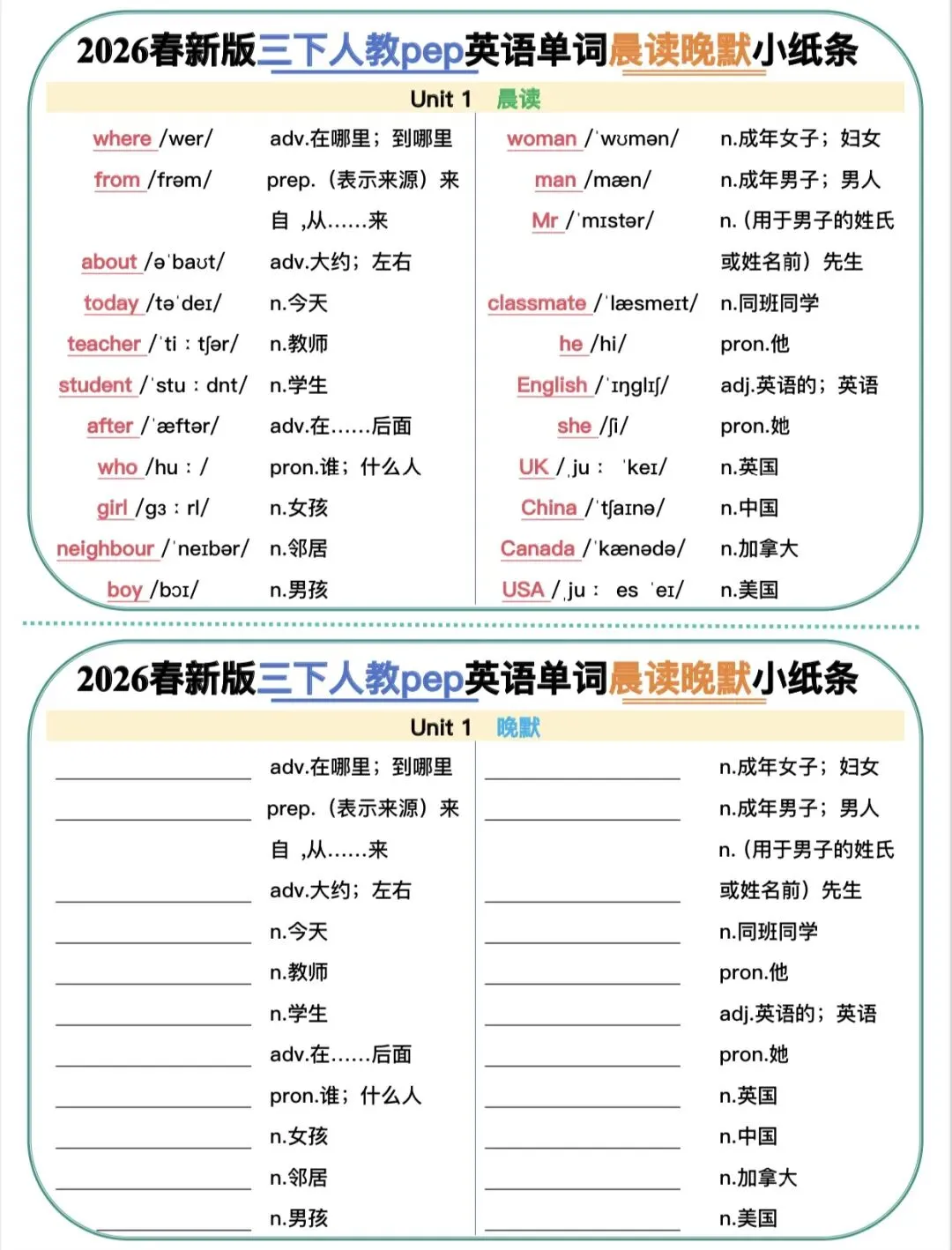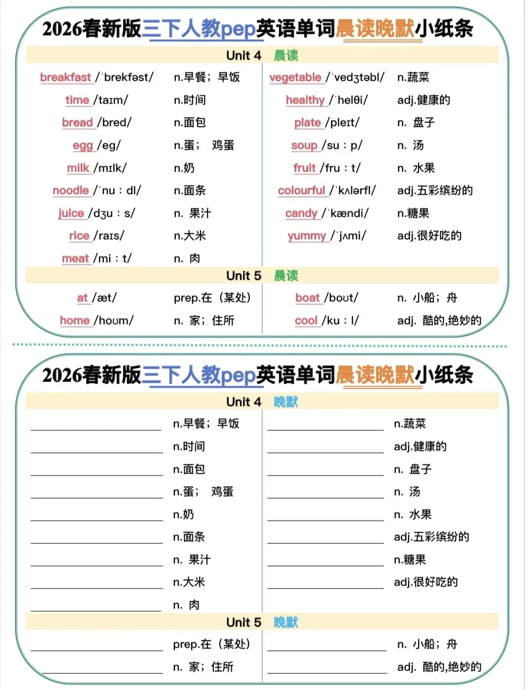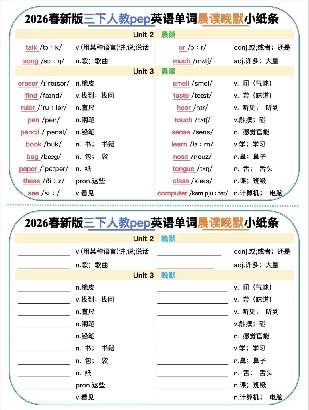 三年级下人教版英语晨读晚默小纸条|可打印
