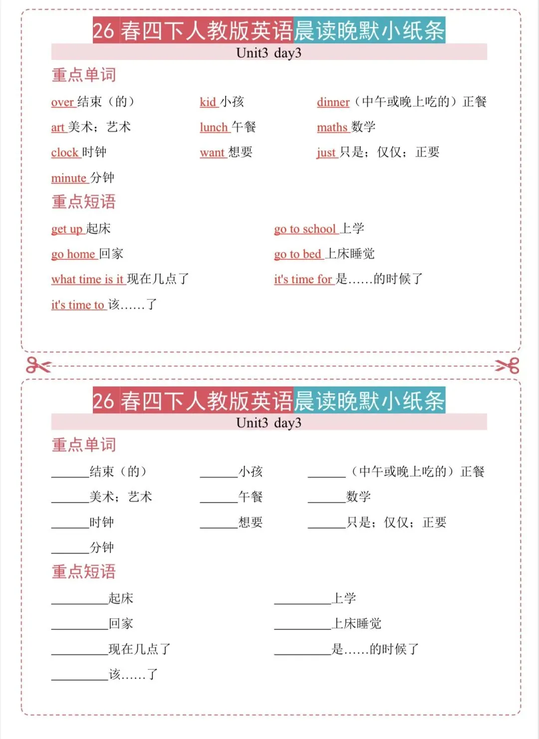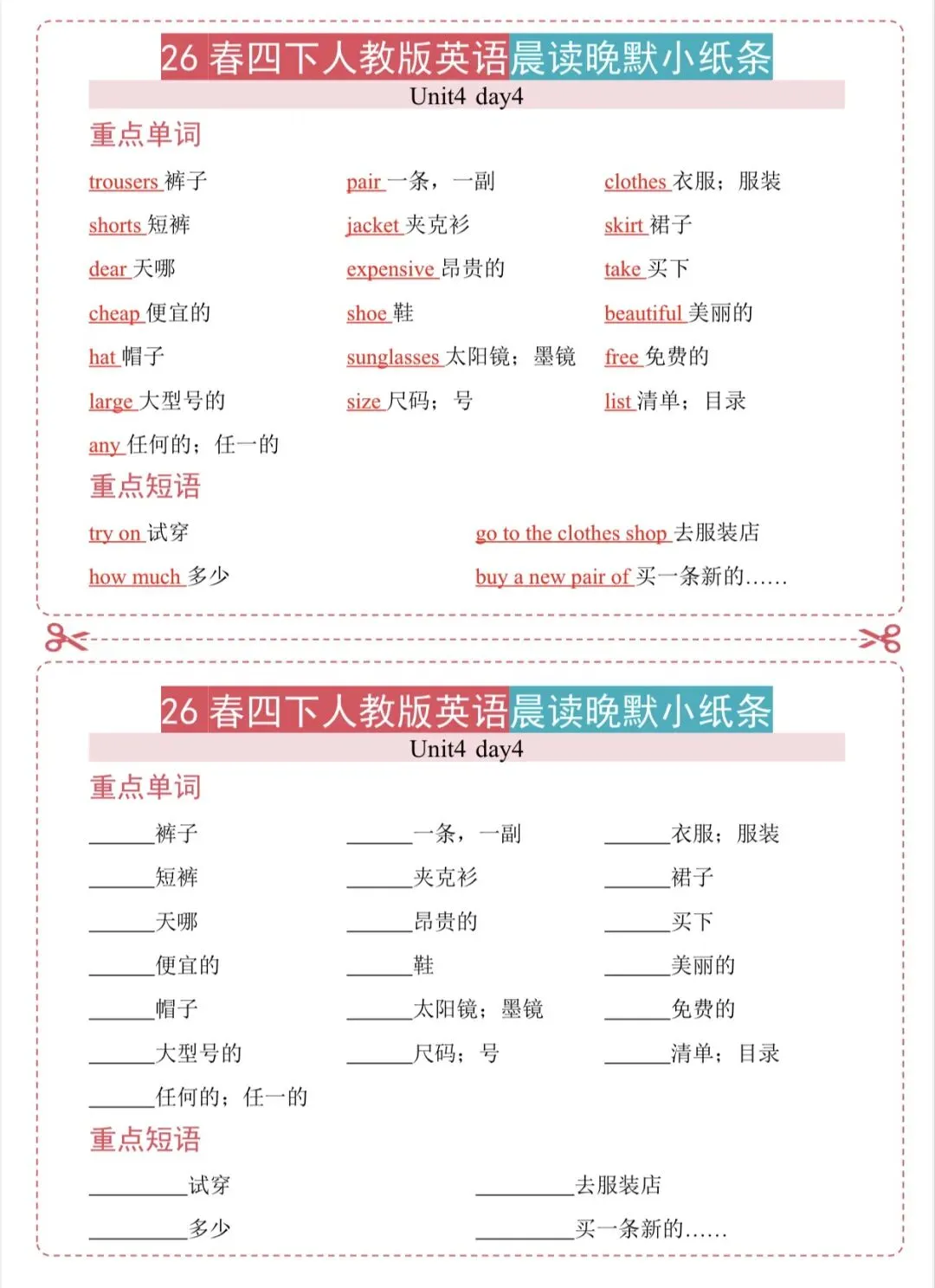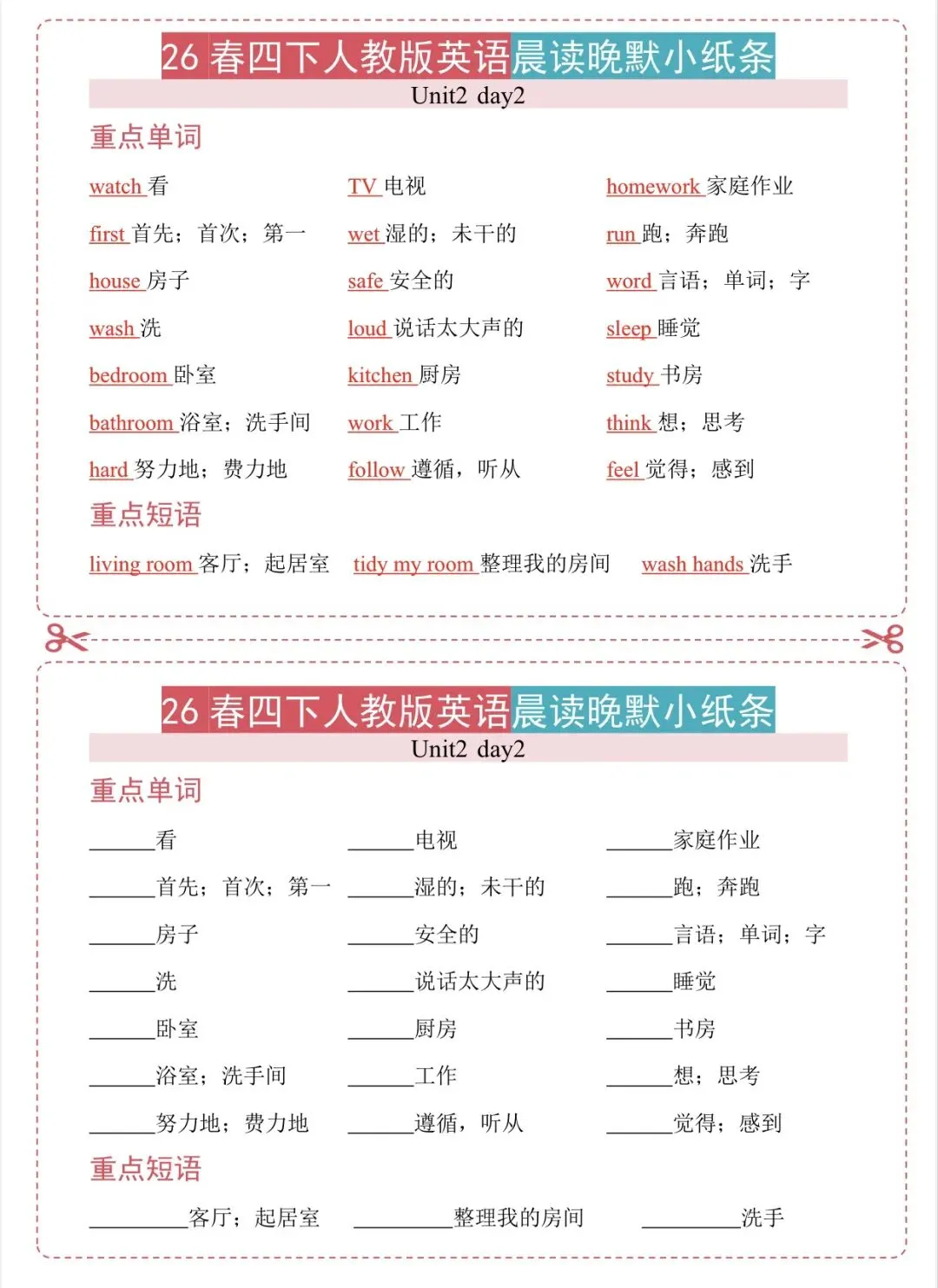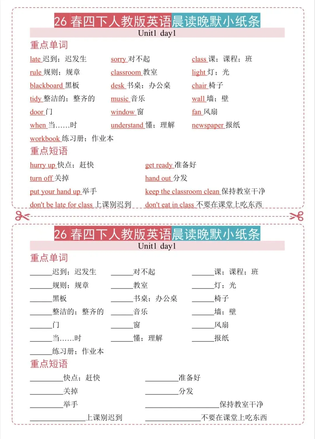 本站文章均为手工撰写未经允许谢绝转载:夜雨聆风 » 四年级下人教版英语晨读晚默小纸条|可打印