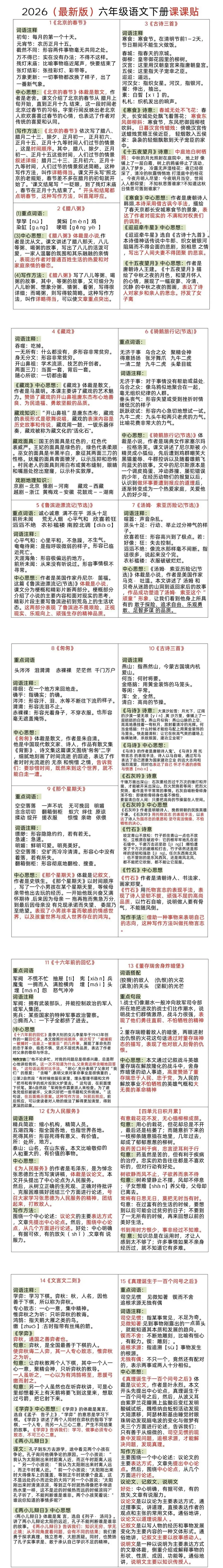 《六年级下册语文课课贴彩色版》课文内容和知识点识字、写字、词语积累、句式练习、中心思想等。包括古诗、现代文、寓言故事、童话故事等多种类型的课文。每篇课文后都列出了需要学生掌握的生字、多音字、同音字和形近字,以及近义词、反义词和重点句式。此外,文档还总结了每篇课文的中心思想,帮助学生理解文章的主旨和情感。通过学习这些内容,学生可以增加词汇量,提高阅读理解能力!同时也是复习预习必备材料,赶快保存吧!⭐️学习是长路,陪伴是暖灯。今天的词,明天的题,都是沿途拾起的星光。日积月累,微光成炬,终将照亮孩子的远方!