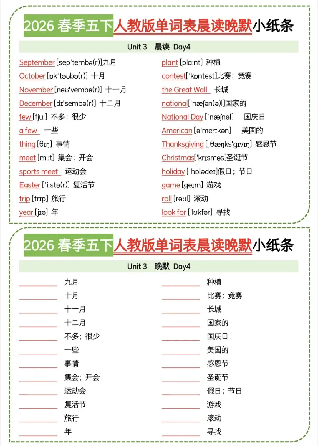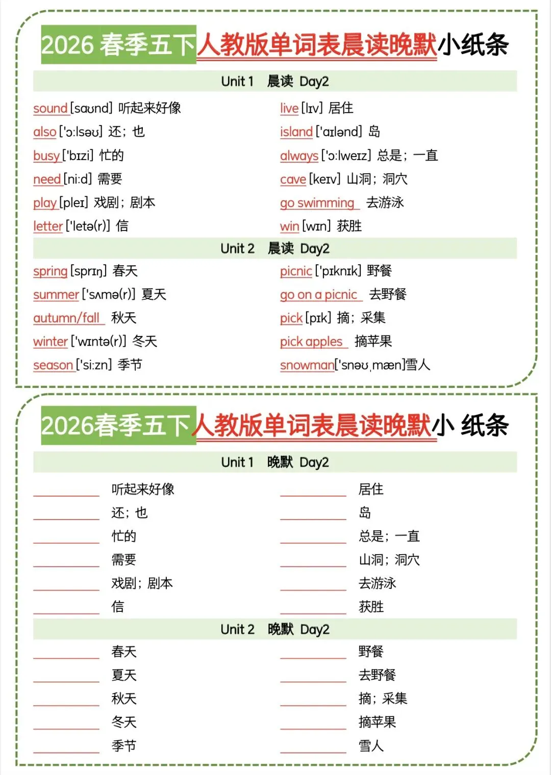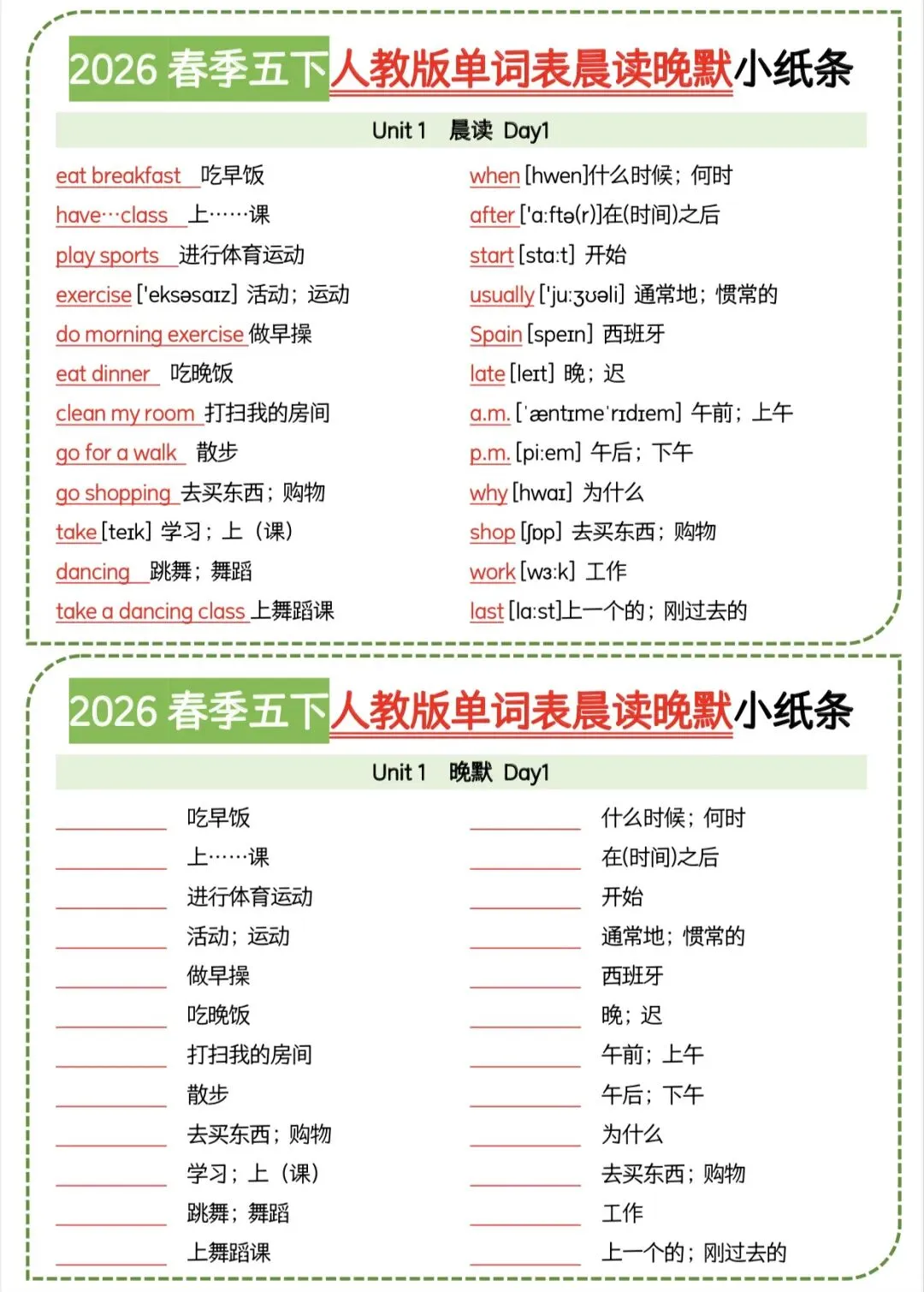 五年级下人教版英语晨读晚默小纸条|可打印