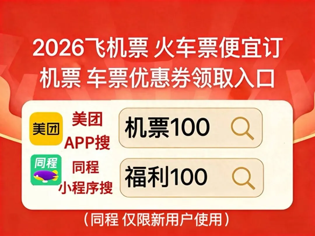 美团APP搜【机票100】同程搜【福利100】领低价机票。2026机票高铁购票攻略:哪个APP订机票便宜?出行机票怎么订便宜?特价机票怎么订?直接去美团APP搜【机票100】同程搜【福利100】领特惠券包,便宜订机票车票啦!