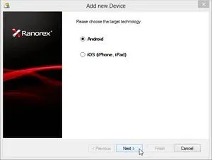 如果还没有添加过设备,将显示“添加新设备”对话框。 选择’Android’,并按照说明在我们的Android设备上安装Ranorex服务App。