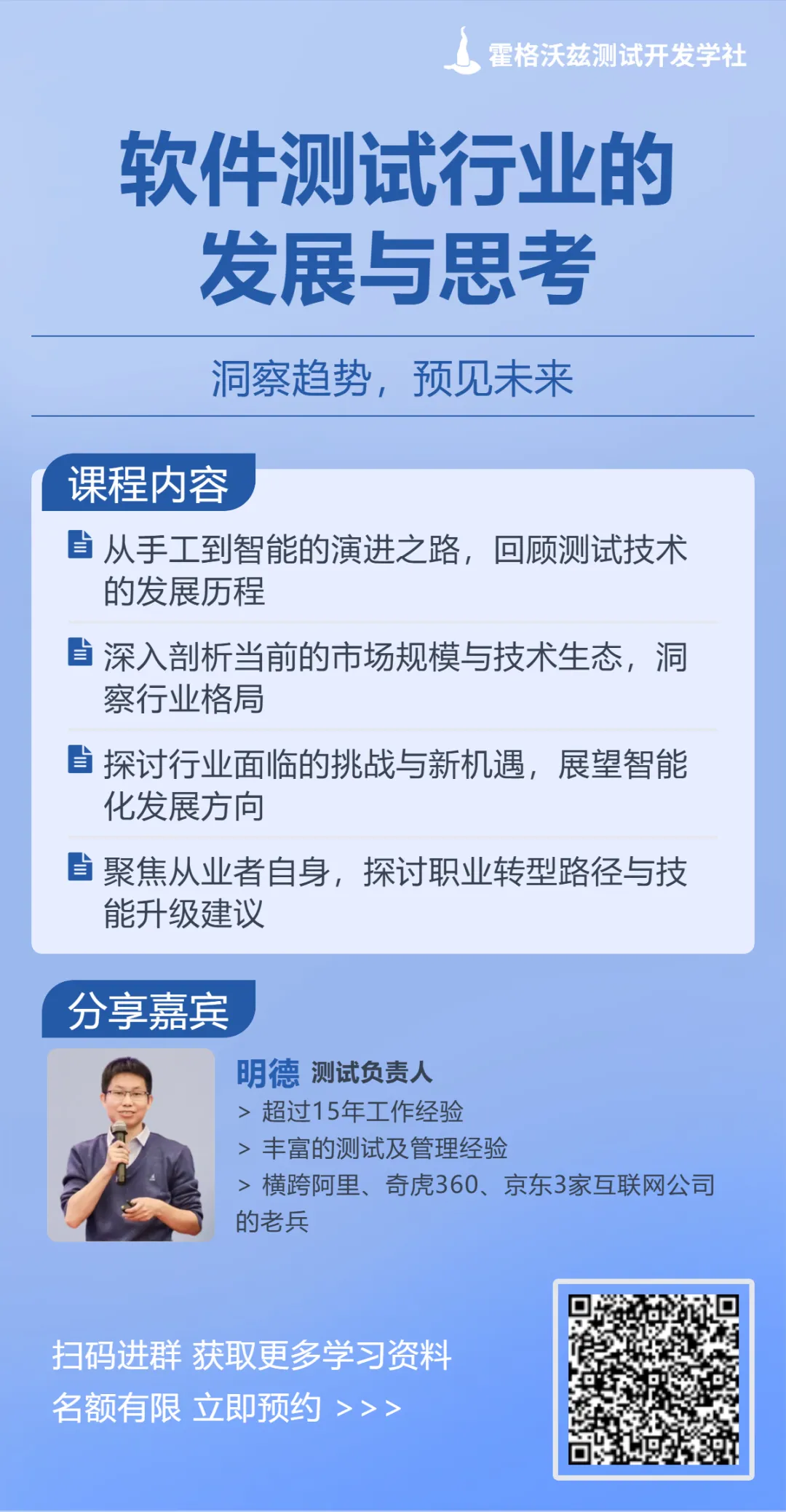 0306日(周五)2000,明德老师将和大家一起聊聊软件测试行业的发展与思考,本次公开课限时免费,快扫描海报二维码报名吧~