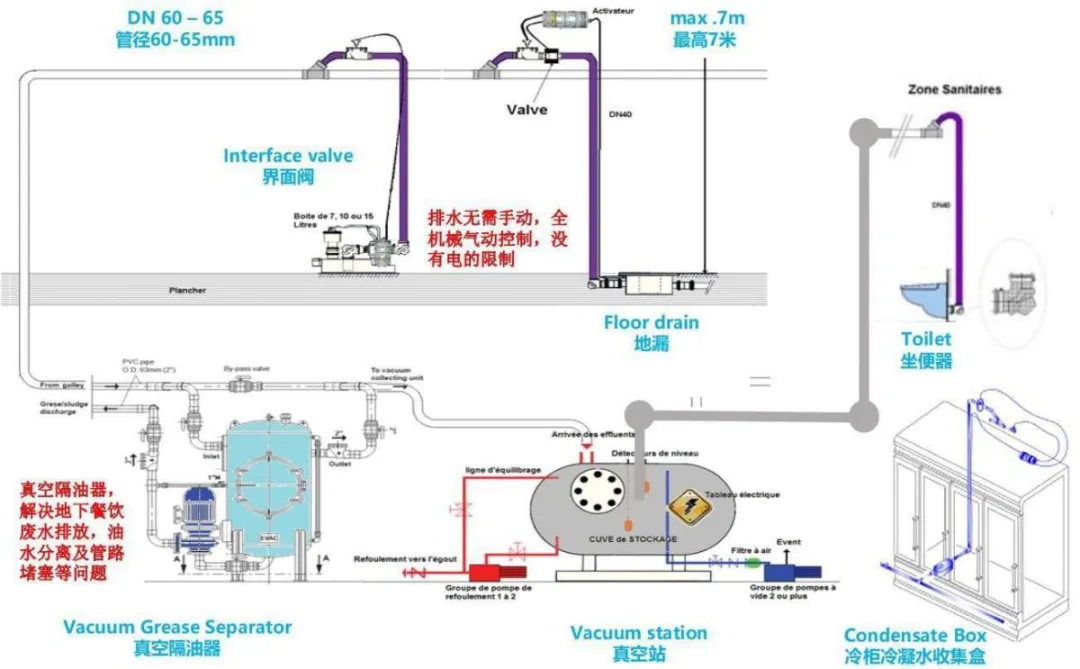 (2)净化室内空气。除异味,除细菌、悬浮颗粒及有危害颗粒。由于真空系统的工作原理是依赖压差,通过大气推送污水污物进入真空管网传输,因此真空系统每次排水时,都会带走排水点附近60L左右的空气;与此同时,空气中的有害悬浮物、细菌、异味也将随着排水动作进入真空管网,实现室内空气净化的效果。这个技术特点尤其适用于人流密集且通风不佳的地方,省去了集水坑和提升泵,对环境有非常明显的改善。
