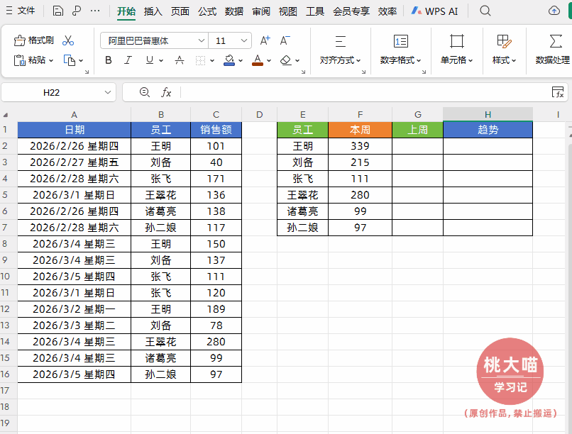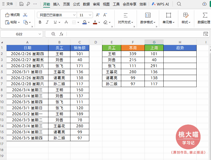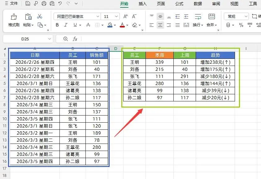 如下图所示,我们需要根据左侧的销售明细表格数据,自动汇总本周和上周每个员工的销售业绩以及业绩变化趋势。