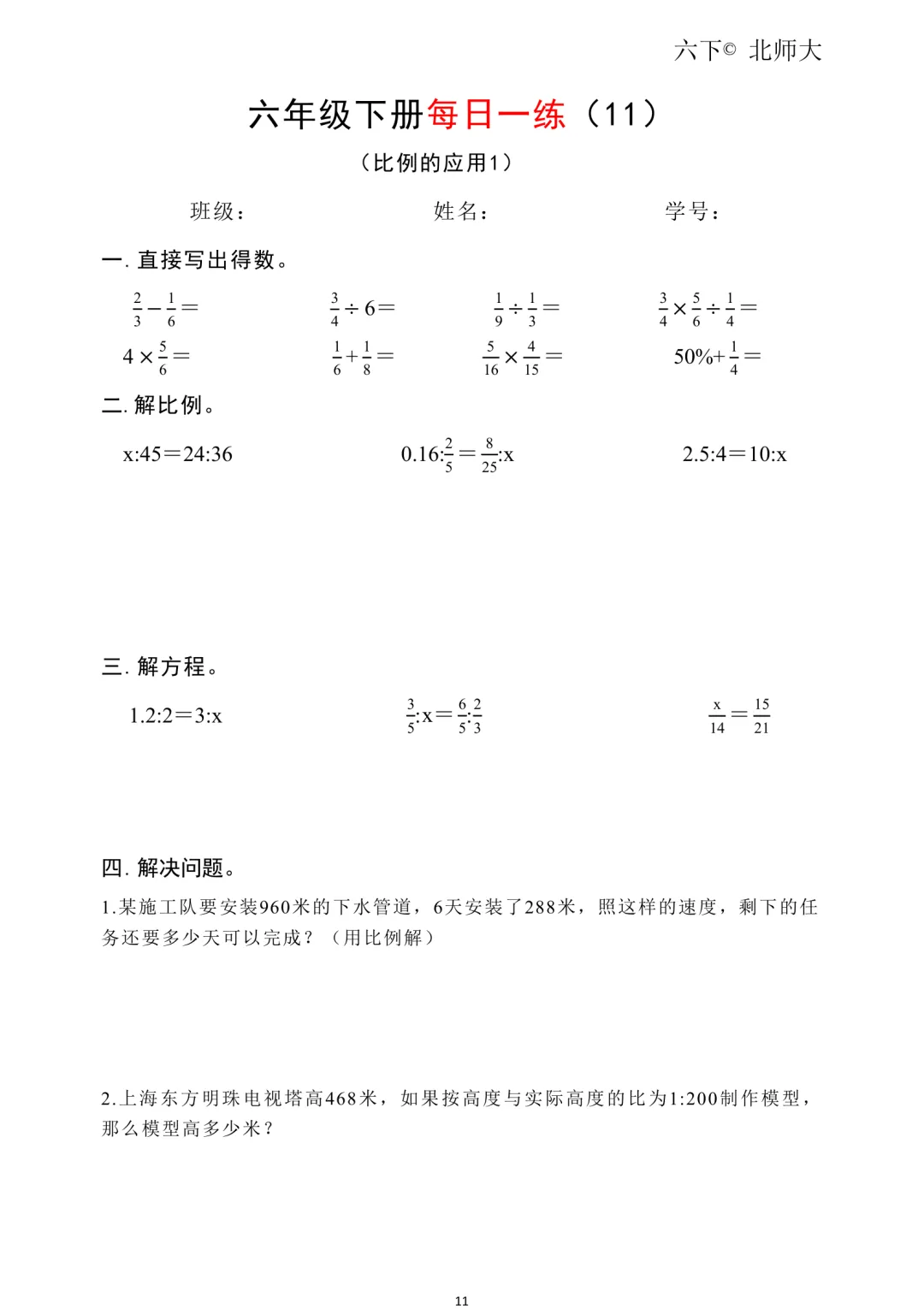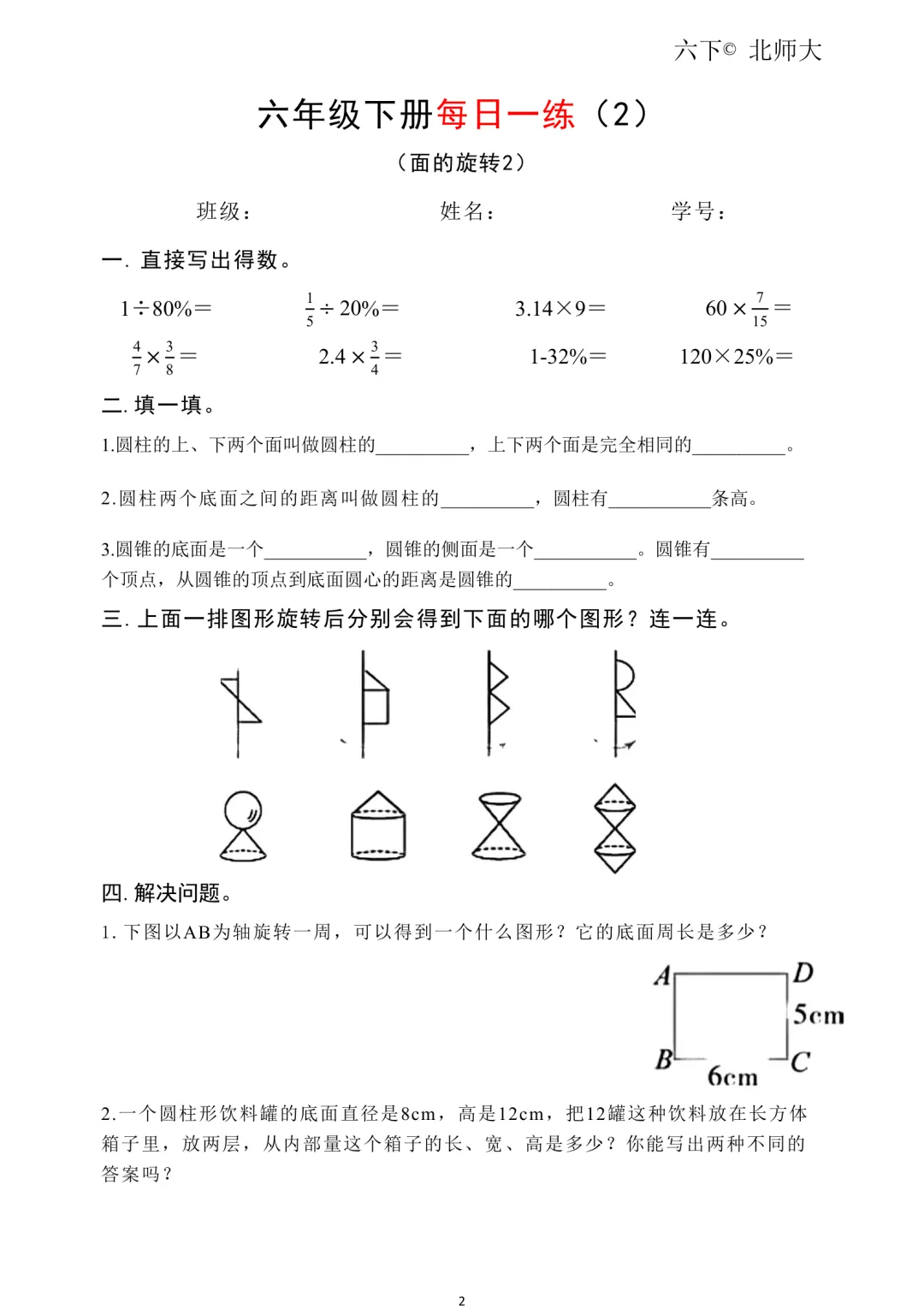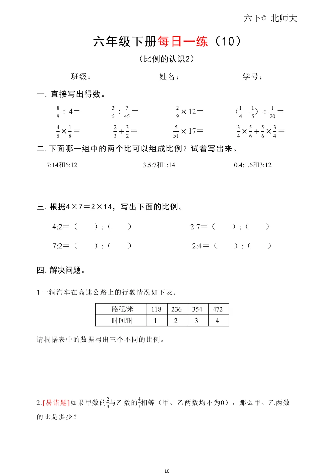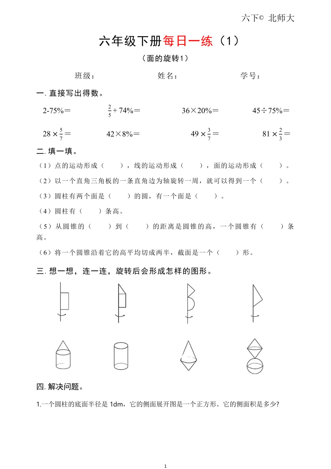 26春新六年级下册北师大版数学《同步课本·一课一练/课时练/课后小测/(含基础篇、提高篇、拓展篇)》高清可打印