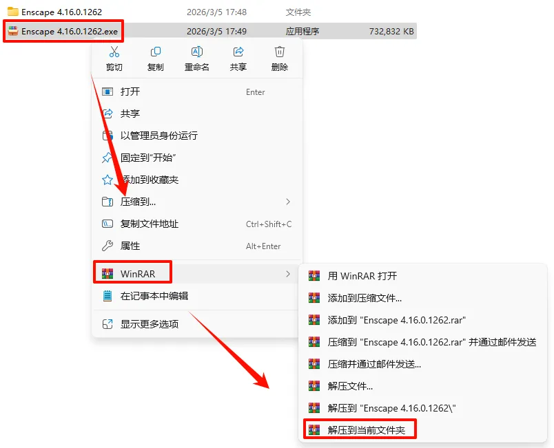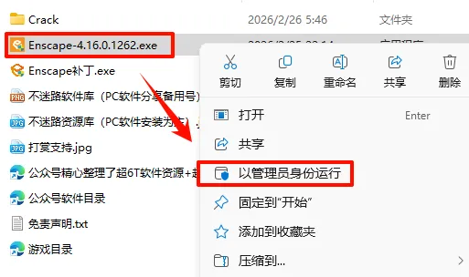 2.打开刚刚解压的文件夹,选中“Enscape-4.16.0.1262.exe”文件,鼠标右键选择“以管理员身份运行”