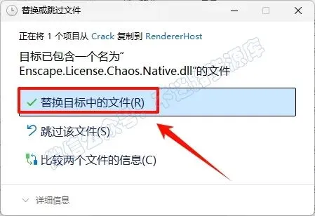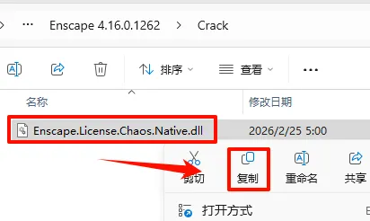8.返回之前解压的“Enscape 4.16.0.1262”文件夹,双击打开“Crack”文件夹,选中“Enscape.License.Chaos.Native”文件,鼠标右键点击“复制”文件夹