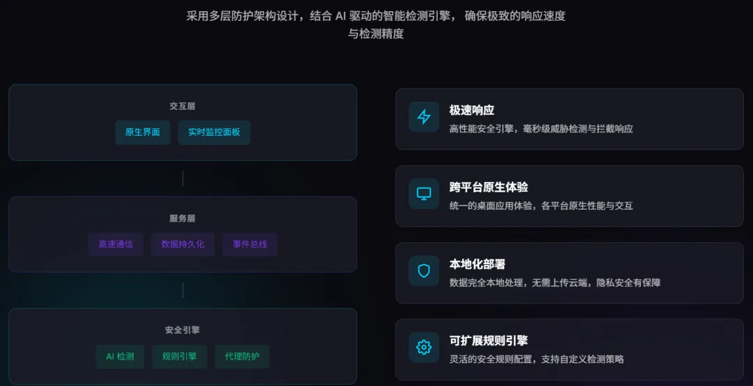 通过多层防护机制与 AI 驱动的风险识别能力,建立一层可感知、可拦截、可追溯的安全边界。