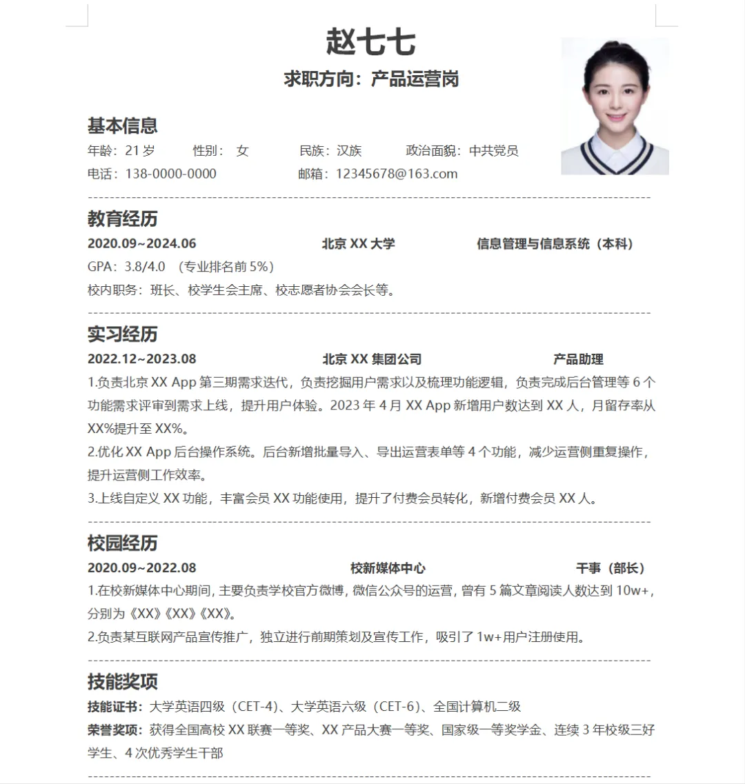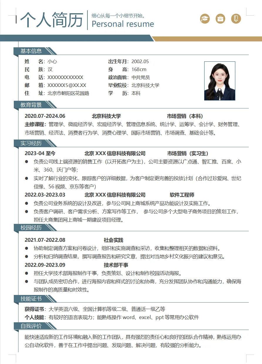 2022.09 ~ 2026.06 北京XX大学 工商管理(本科)