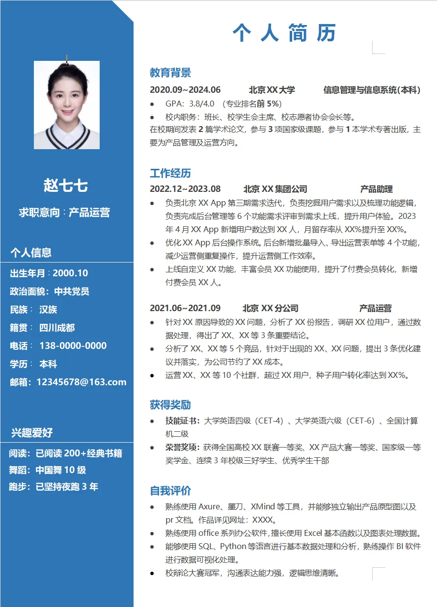 产品迭代: 负责XX App 3.0版本迭代,梳理6项功能逻辑并独立输出原型与PRD。通过优化登录环节与新手引导,助力月留存率从 XX% 提升至 XX%。