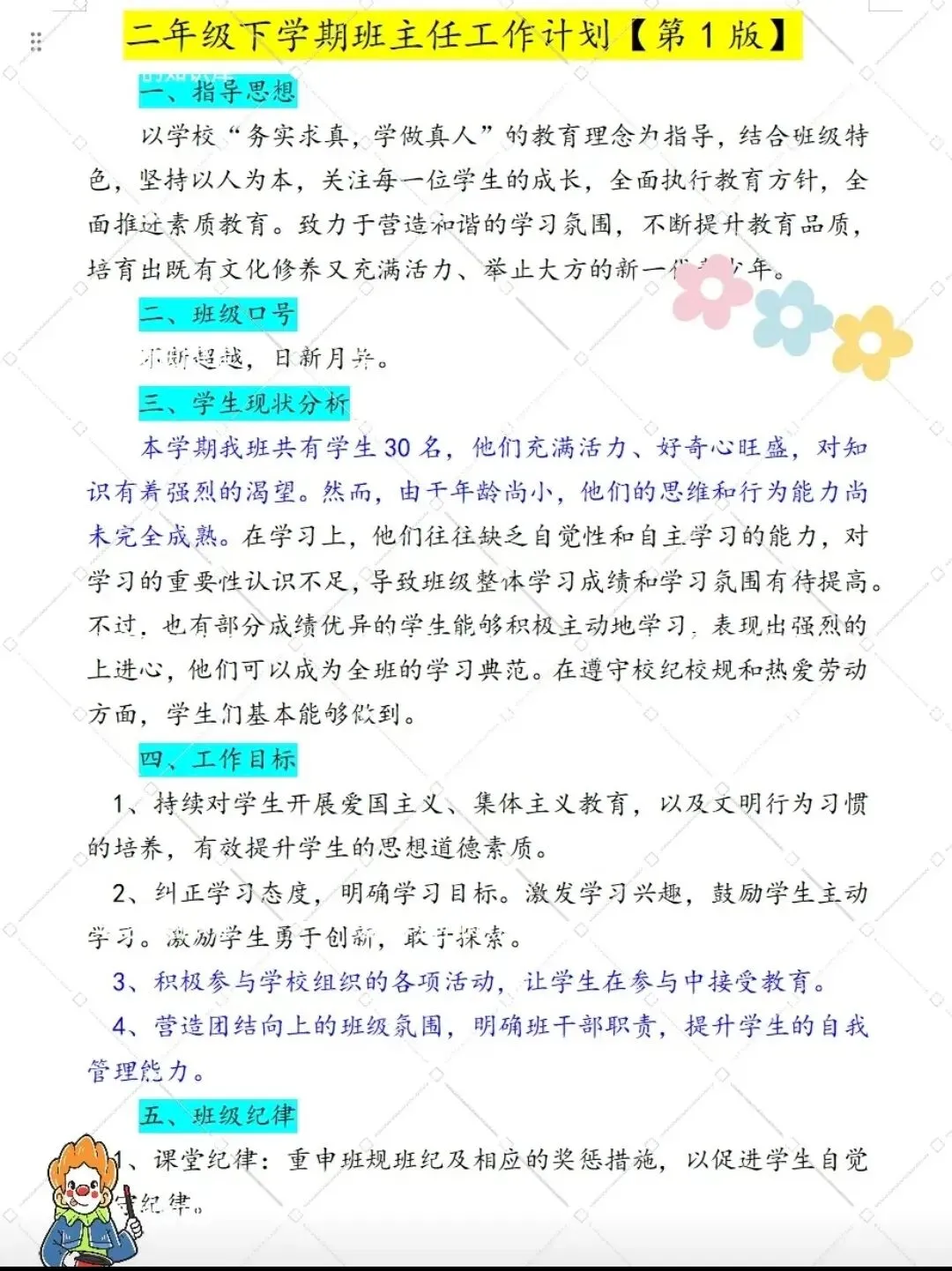 二年级下学期班主任工作计划电子稿【第1版】