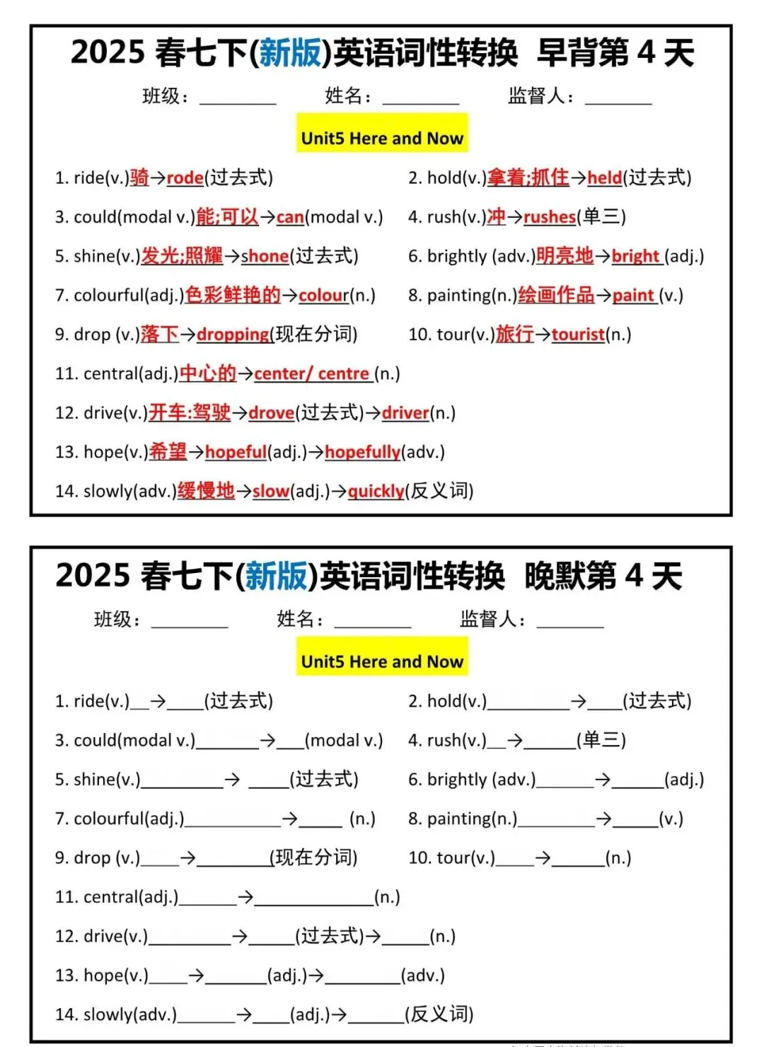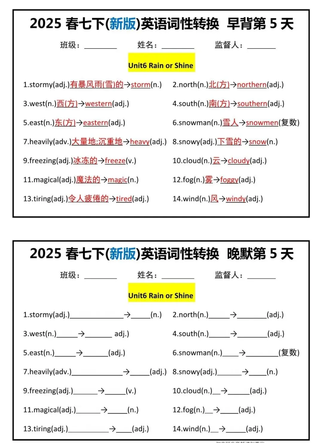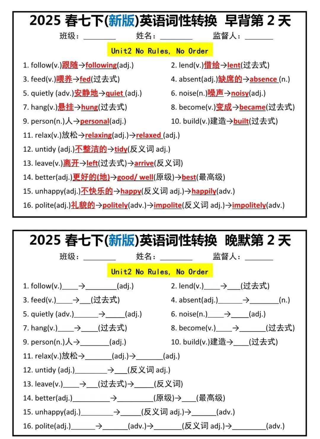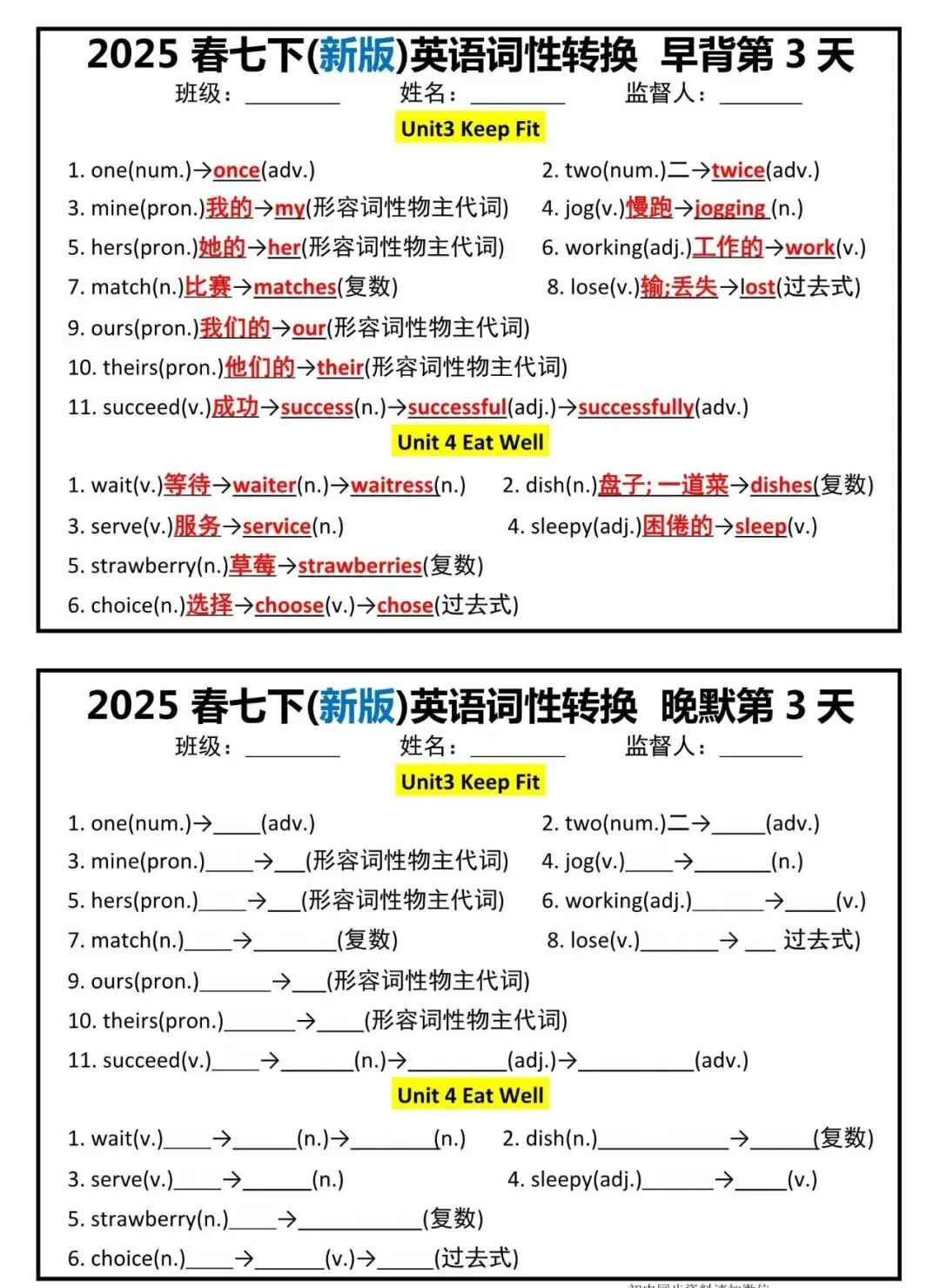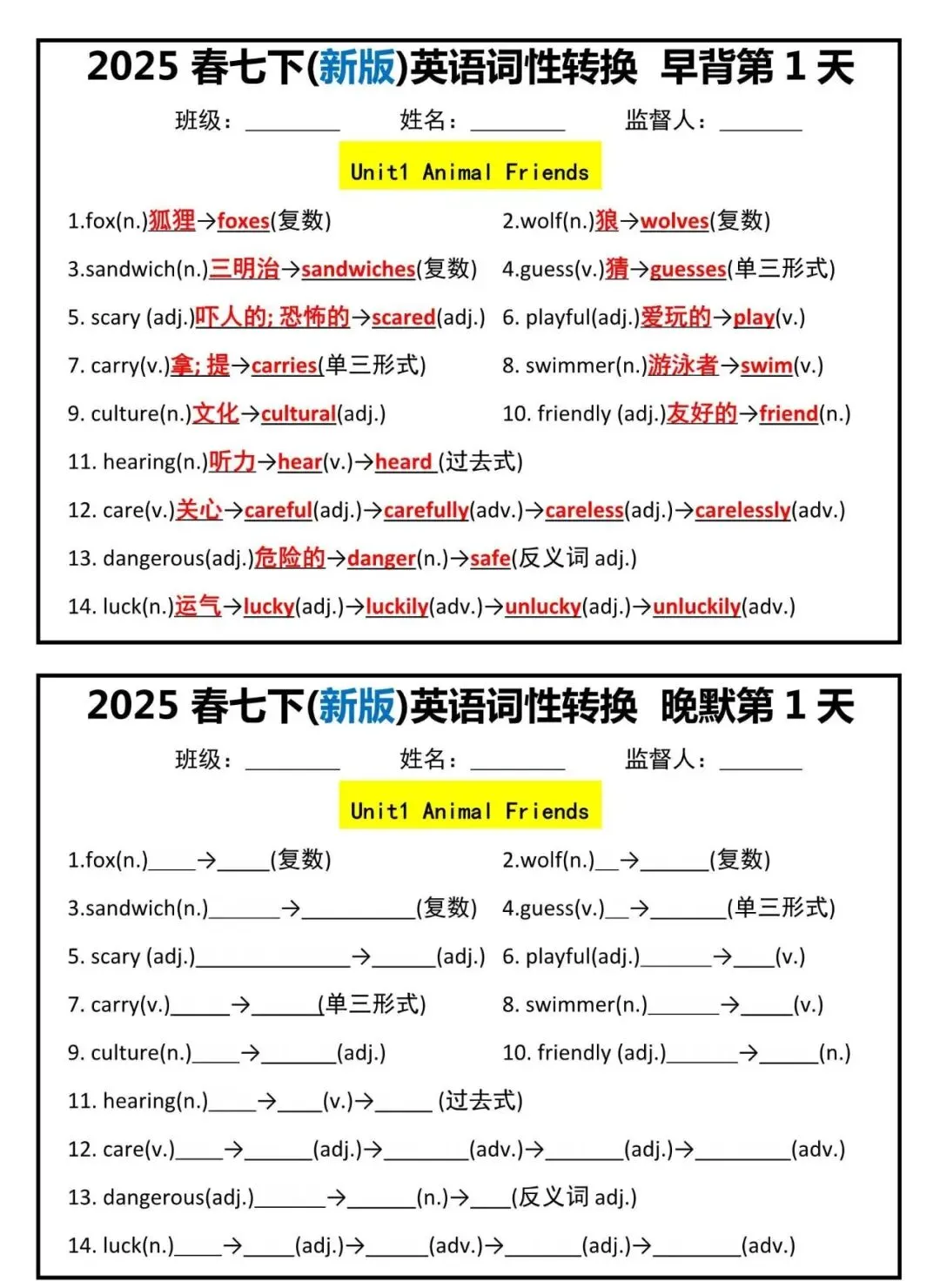 【七下英语】新版七年级下册英语词性转换早背晚默小纸条,附答案解析,完整电子版! 【七下英语】新版七年级下册英语词性转换早背晚默小纸条,附答案解析,完整电子版可打印! 资料为PDF高清无水印 共7页,可打印 展示前5页内容 获取电子打印版请拉到文末查看 (点击可查看大图,超清晰) ▲因篇幅有限,只展示部分资料截图 ▲ 完整版电子版 ↓↓↓ 点击资料下载 获取更多资料,请关注公众号