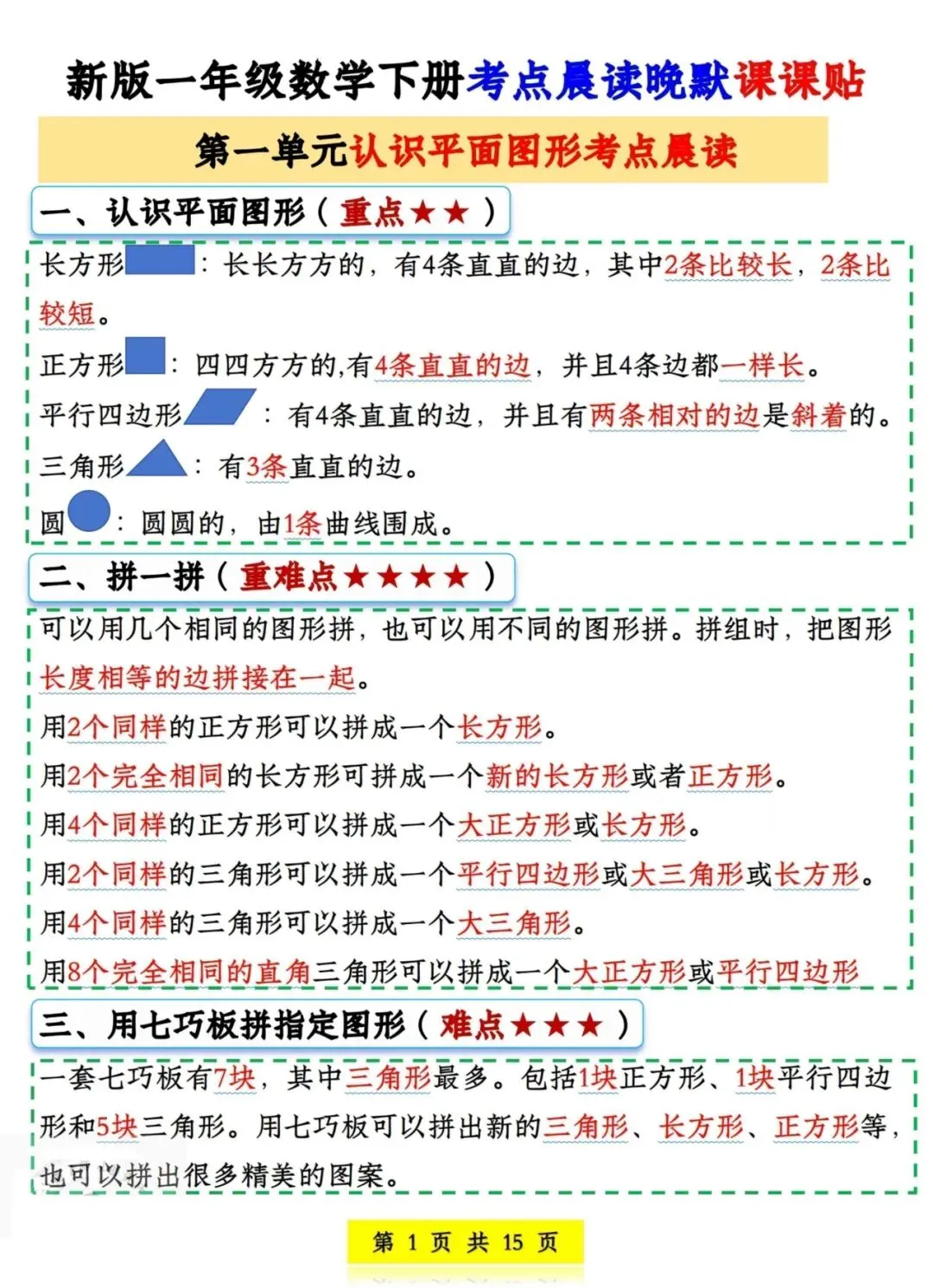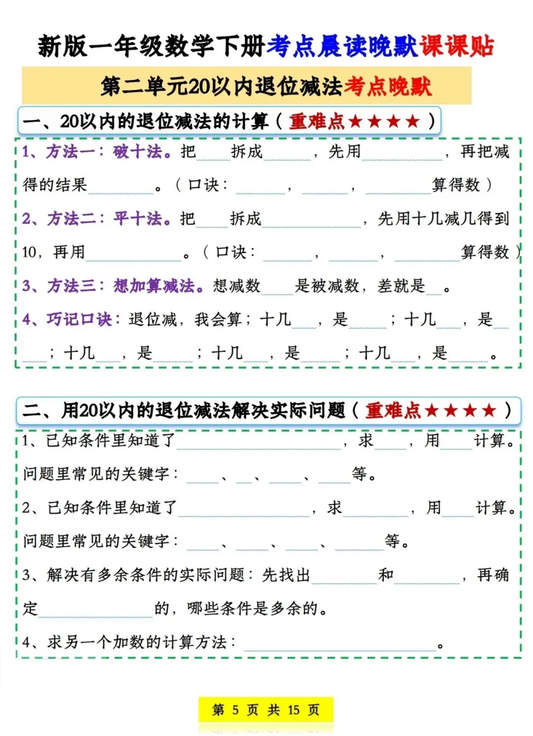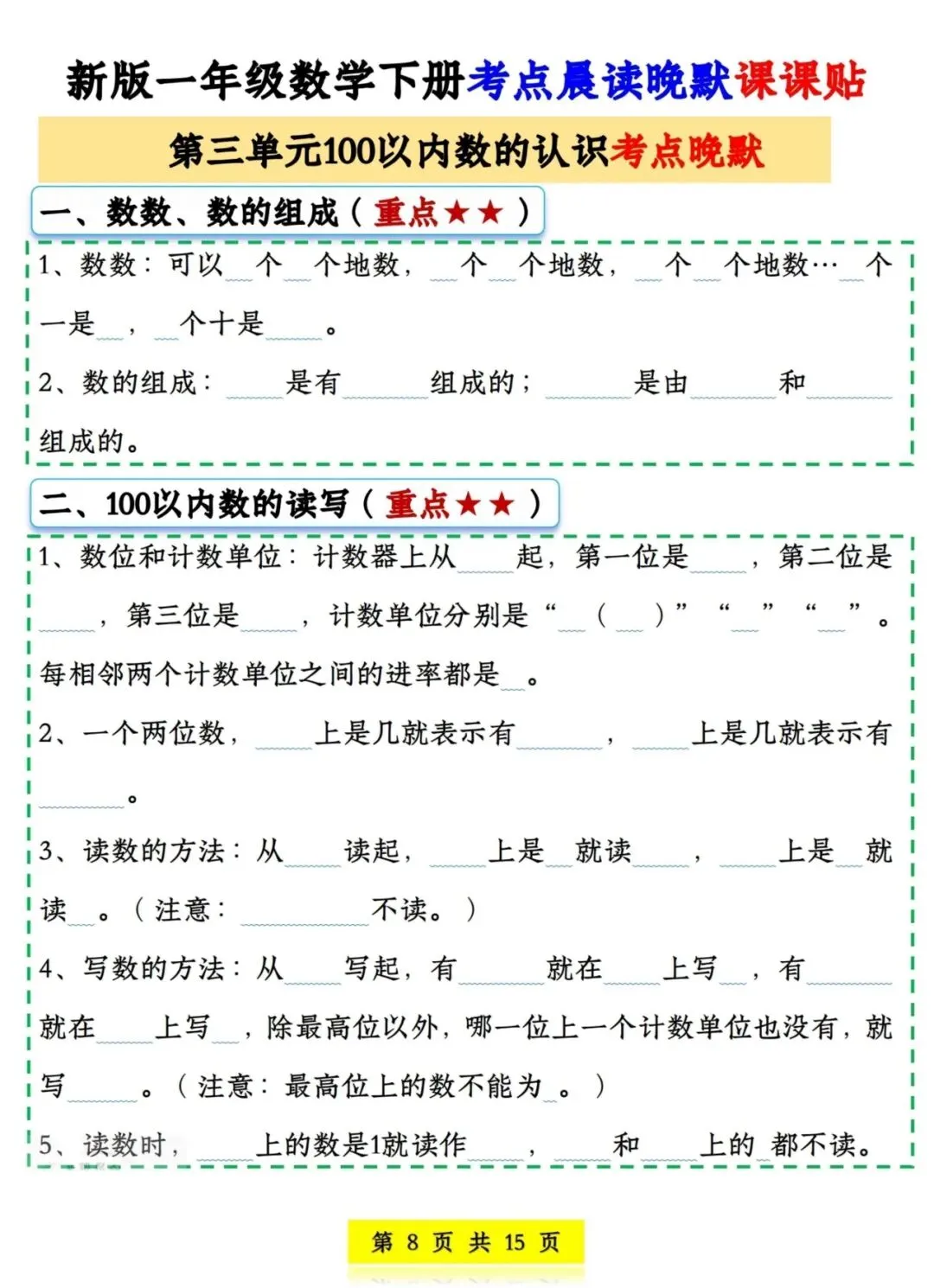 一年级数学下册考点晨读晚默课课贴丨可打印