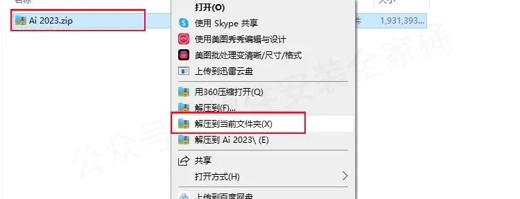 1.打开下载的AI 2023软件安装包,鼠标右击压缩包选择【解压到当前文件夹】。