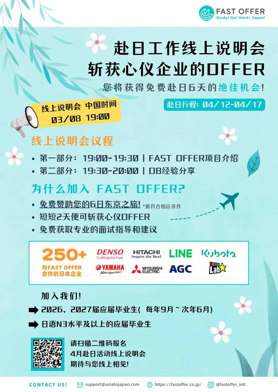 如果你对赴日就业感兴趣,欢迎参加我们的线上说明会,了解FAST OFFER项目流程、企业需求以及成功案例。