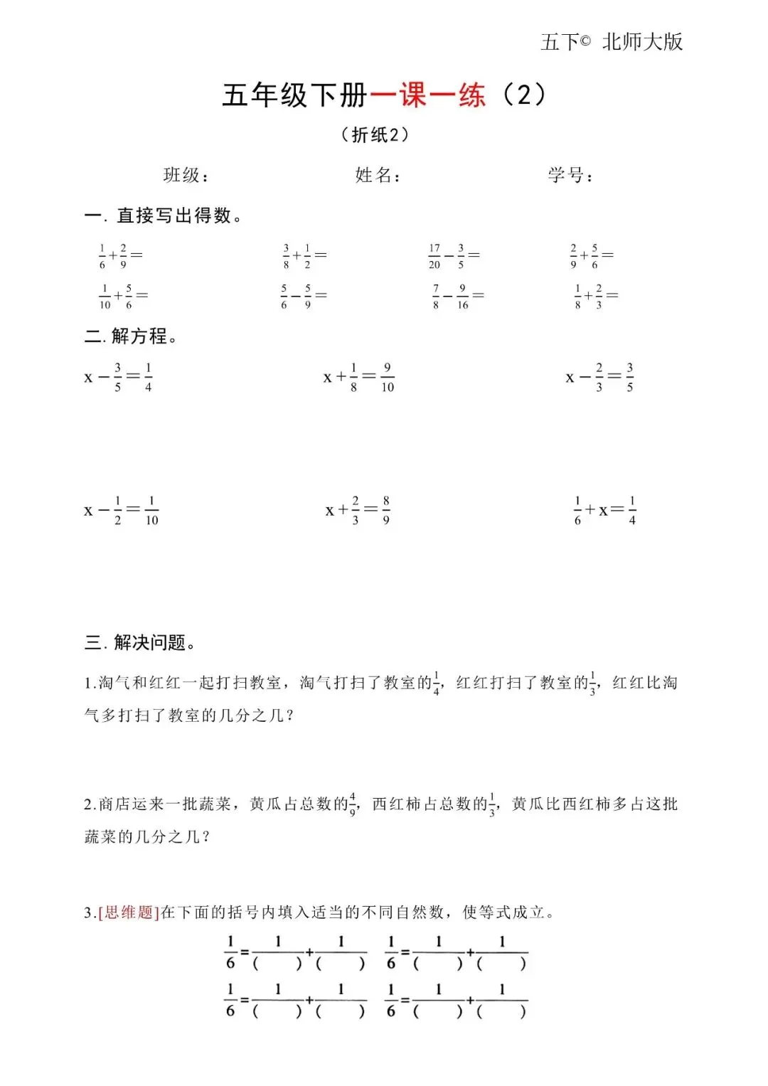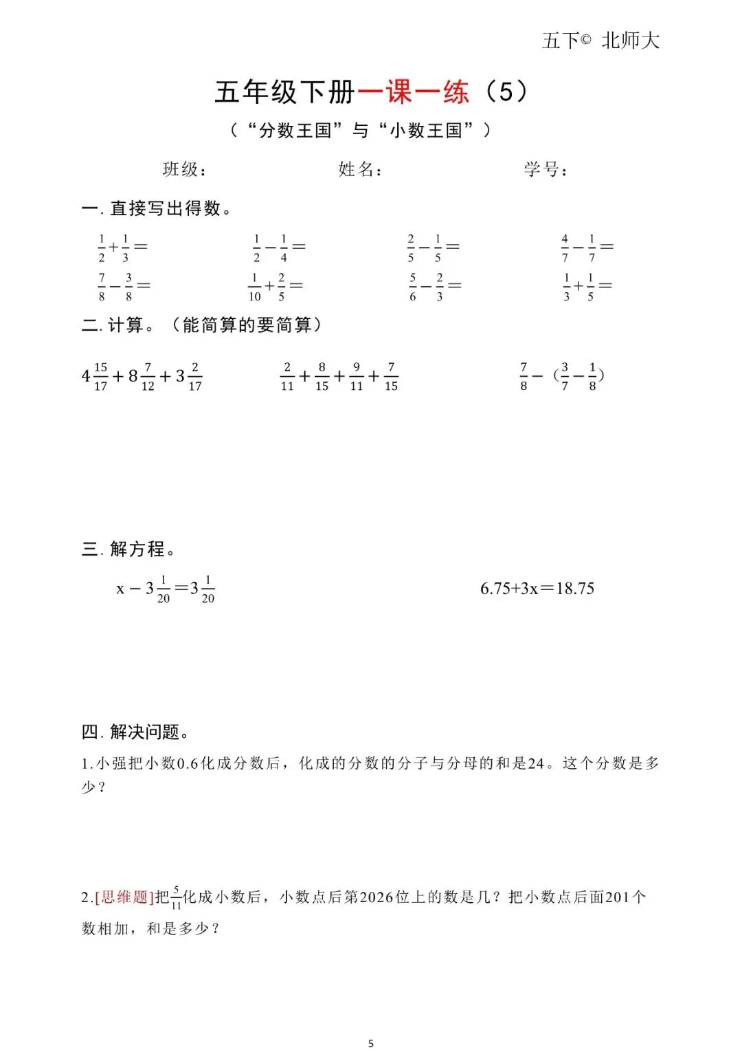 2026春北师大版数学五年级下册《课本同步一课一练》| 完整可打印