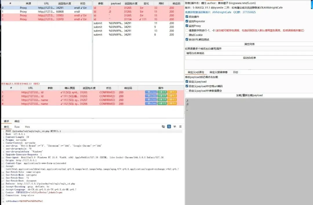S-XIASQL 是一款专业的 Burp Suite SQL注入检测插件,能够自动化检测Web应用中的SQL注入漏洞。通过智能分析HTTP请求响应,快速识别潜在的SQL注入点,大幅提升渗透测试效率。