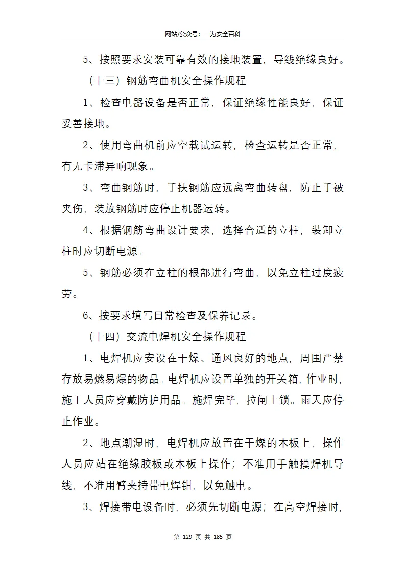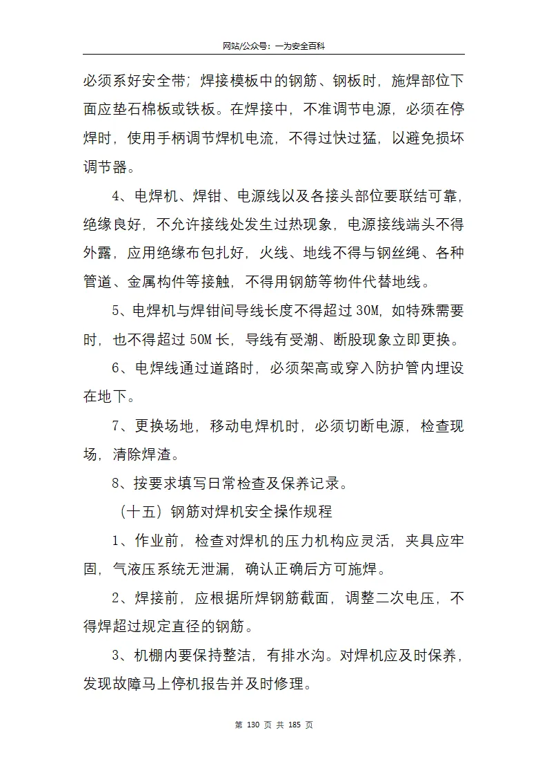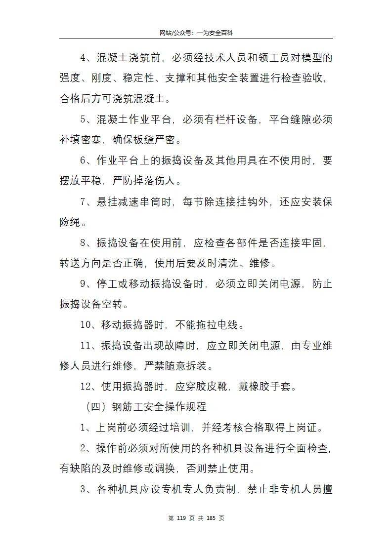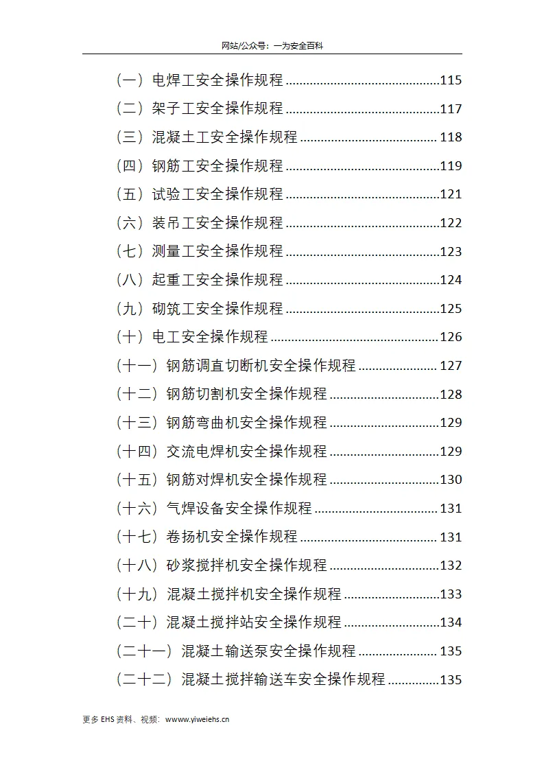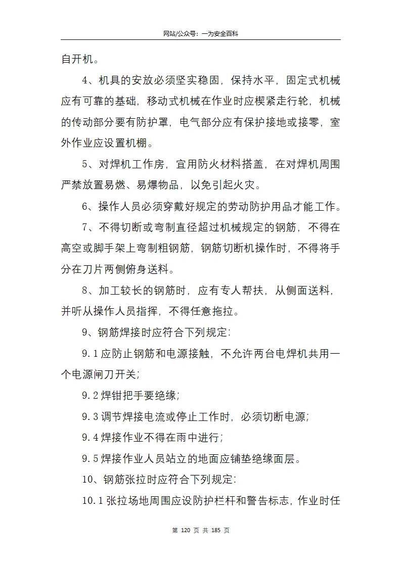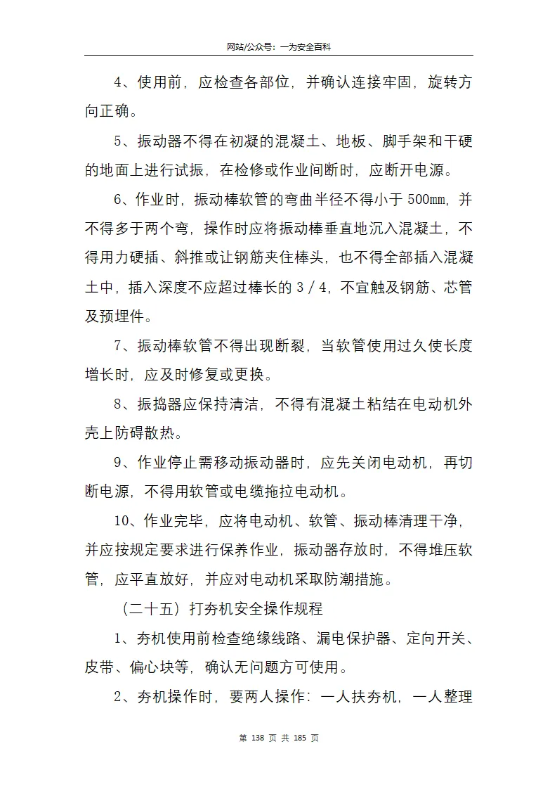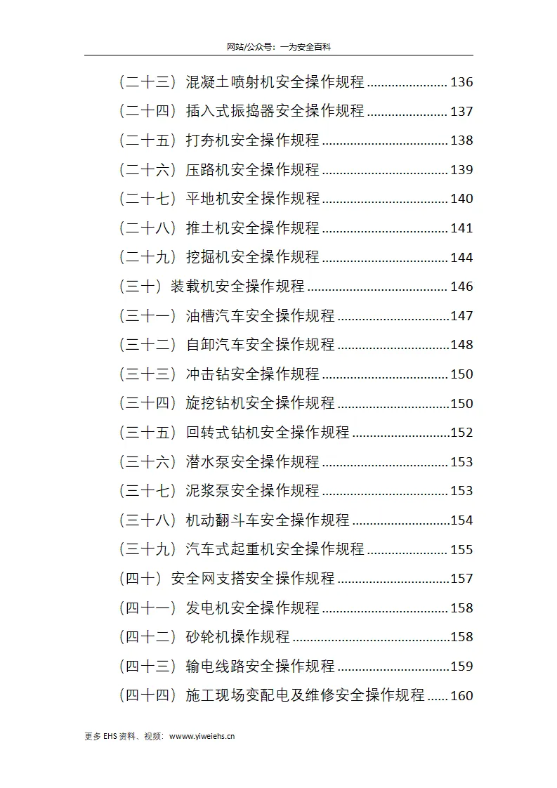 提供了详尽的工种和机械操作安全规程,涵盖电焊工、架子工、混凝土工、钢筋工等常见工种,以及搅拌机、起重机、挖掘机、装载机、钻机等各类施工机械的操作规范,强调持证上岗、劳保佩戴及设备检查。
