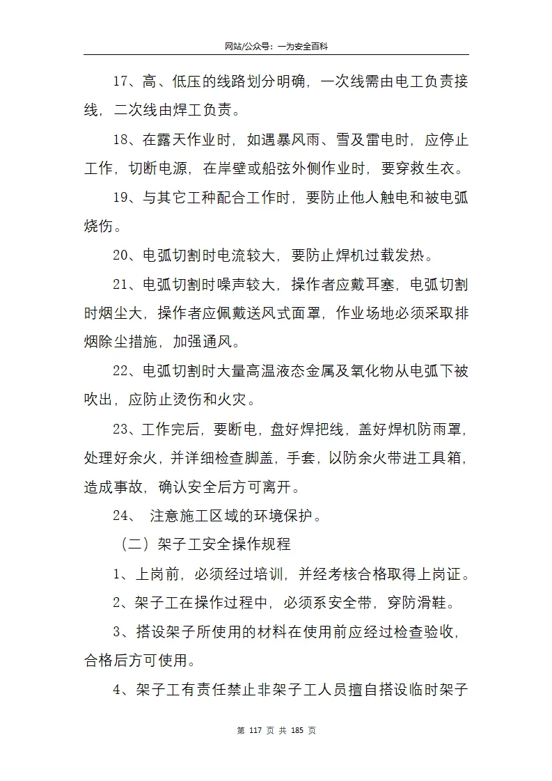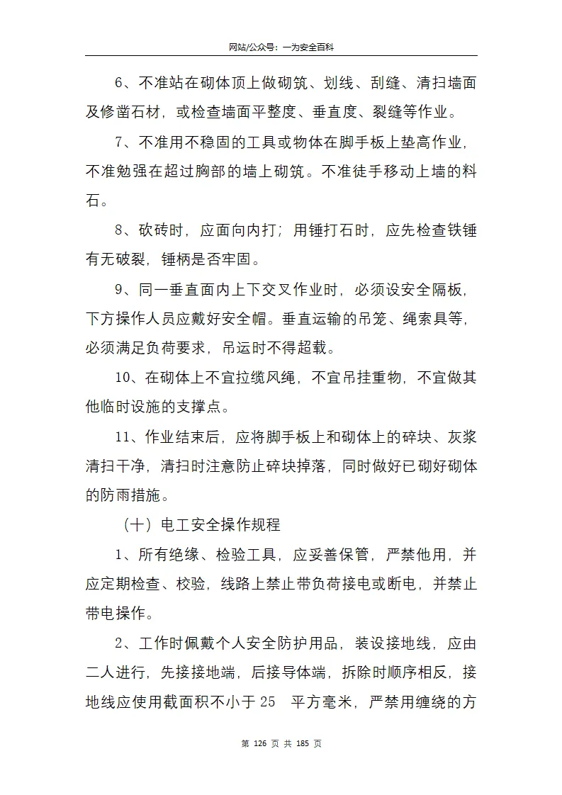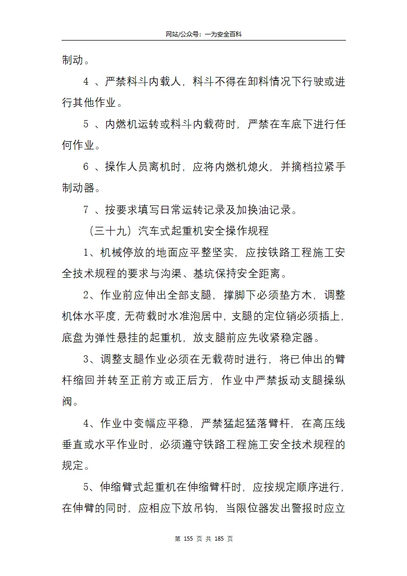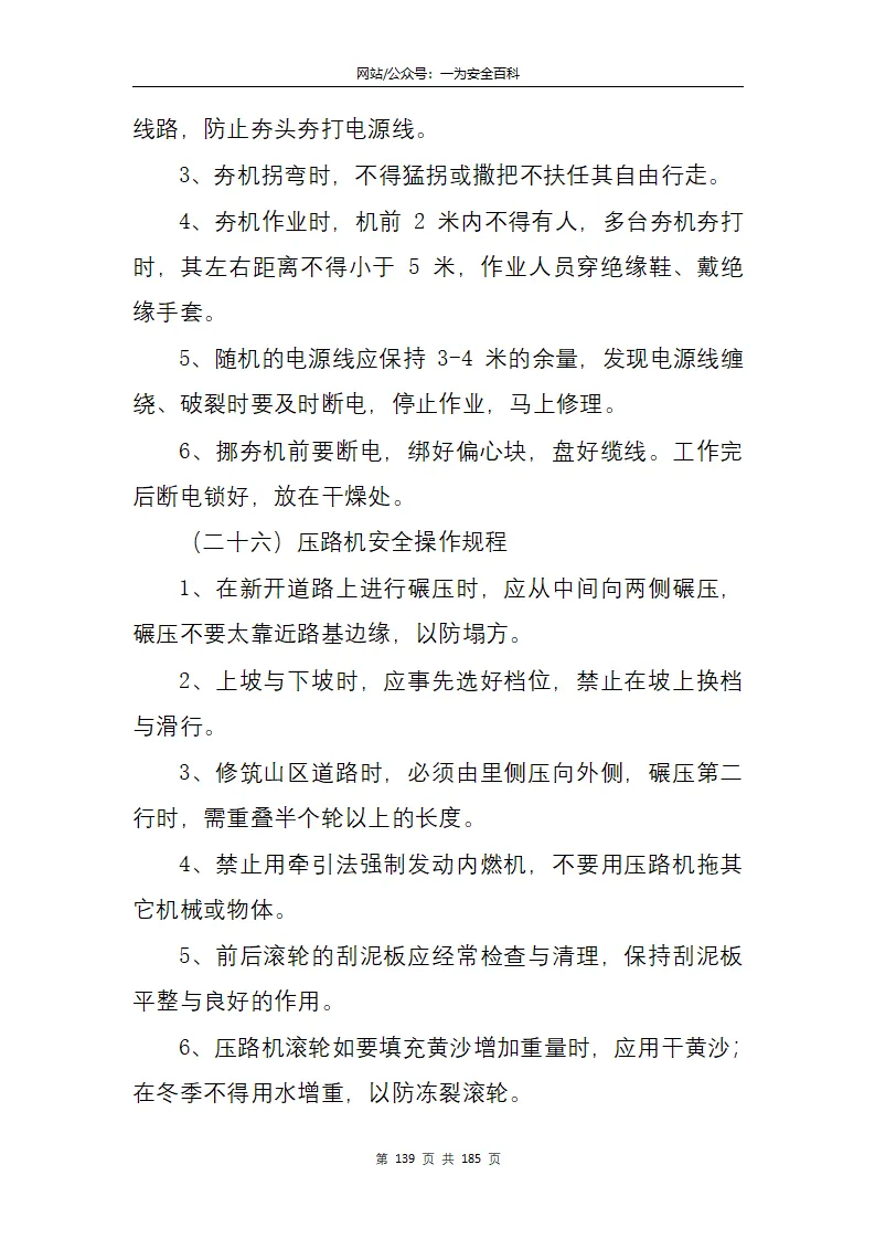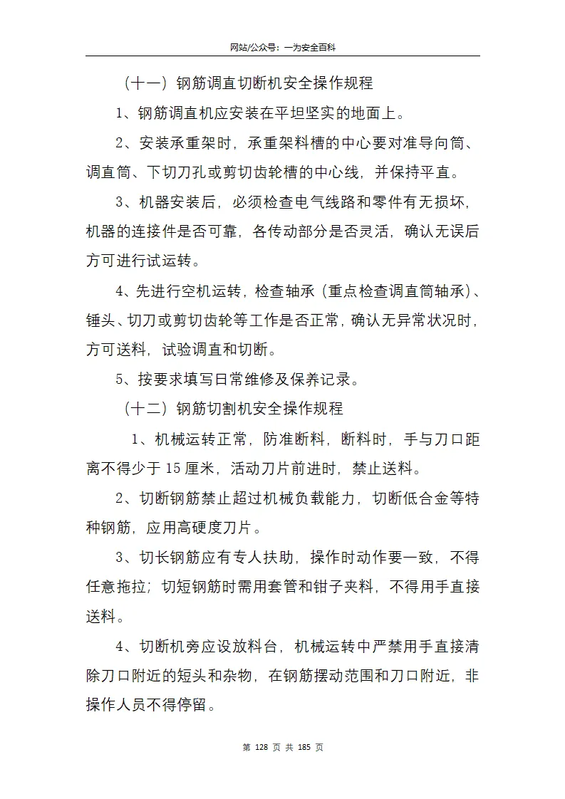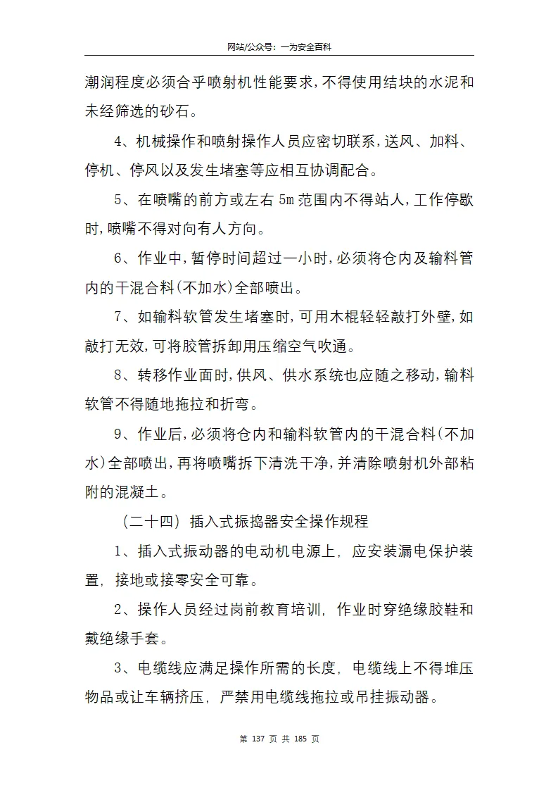 提供了详尽的工种和机械操作安全规程,涵盖电焊工、架子工、混凝土工、钢筋工等常见工种,以及搅拌机、起重机、挖掘机、装载机、钻机等各类施工机械的操作规范,强调持证上岗、劳保佩戴及设备检查。