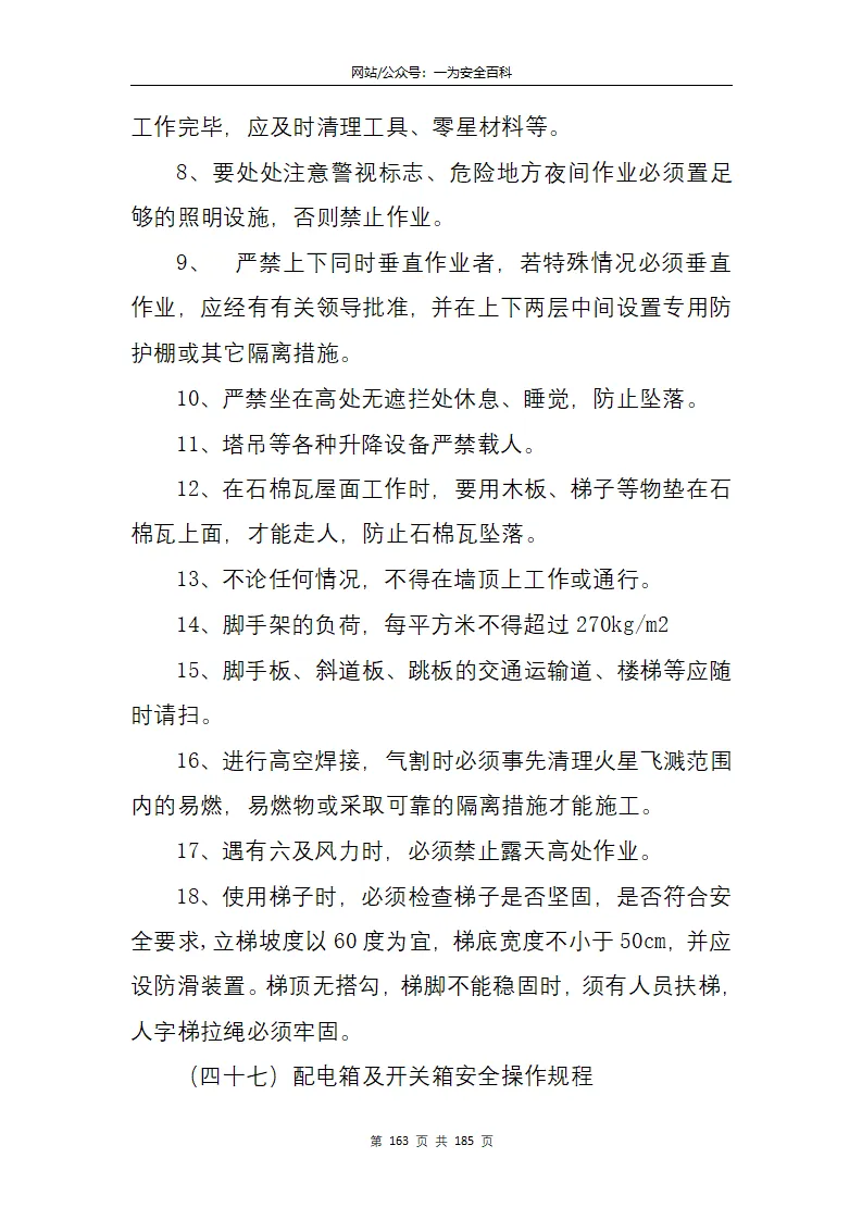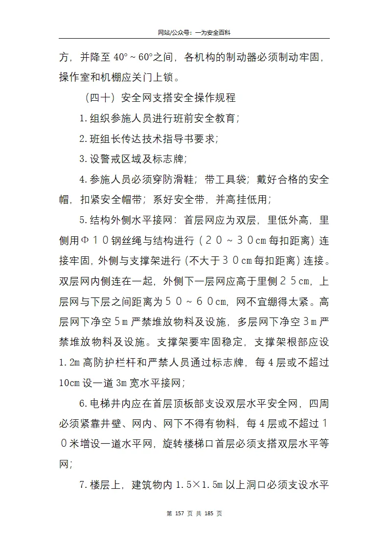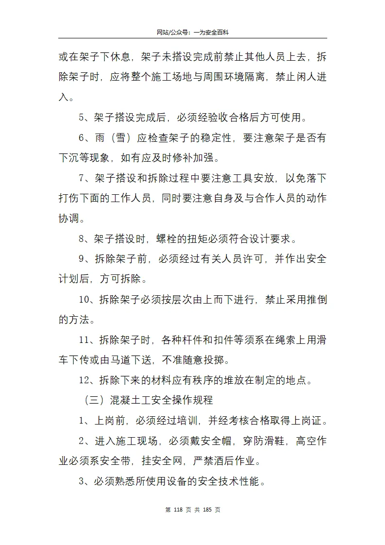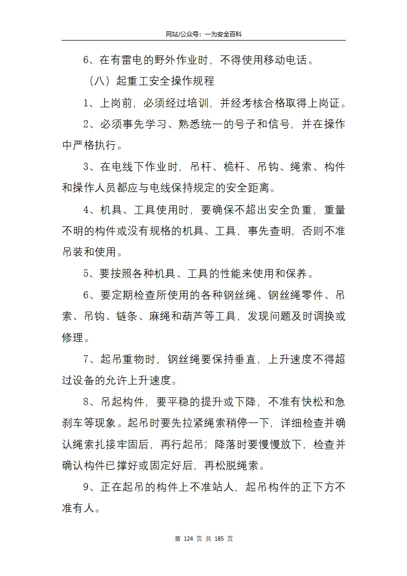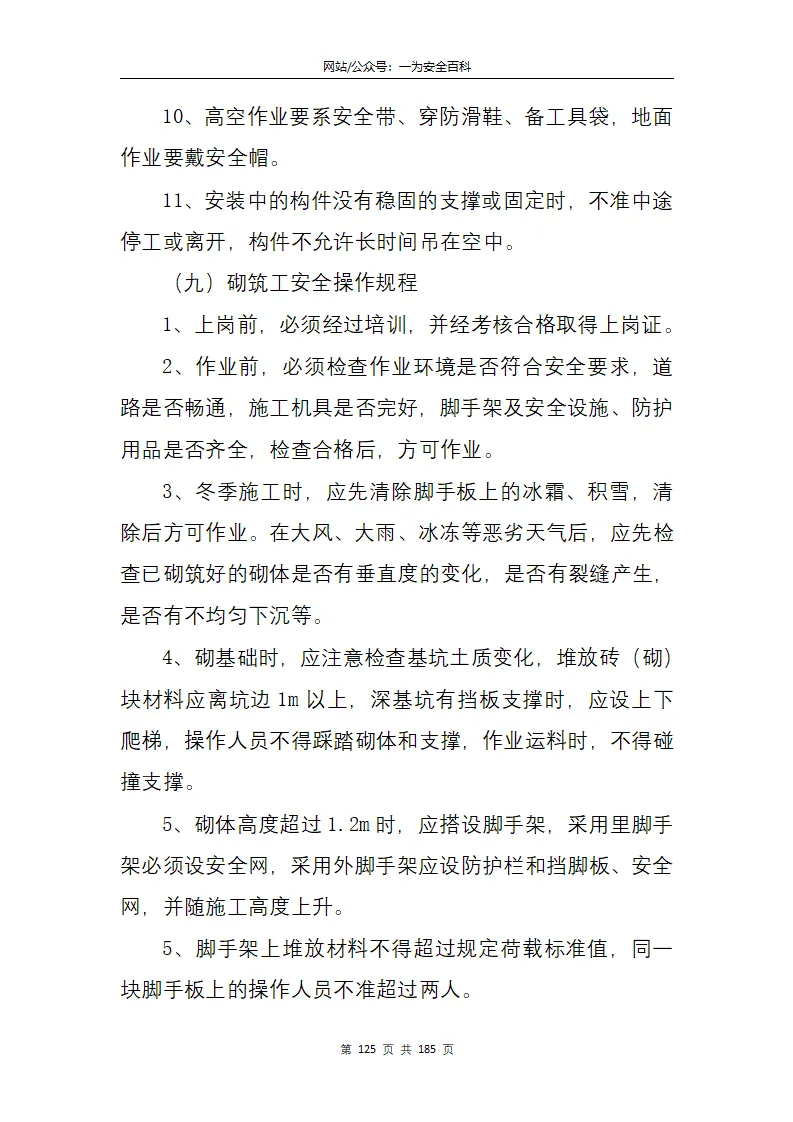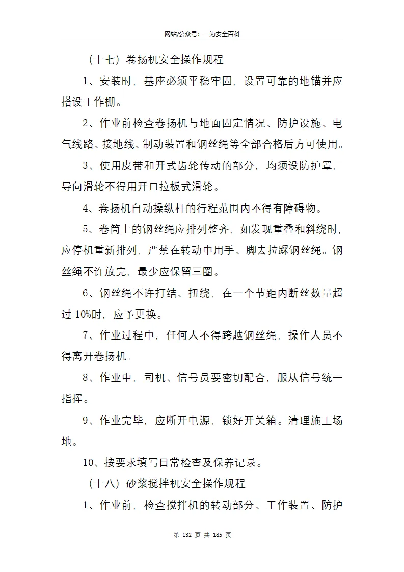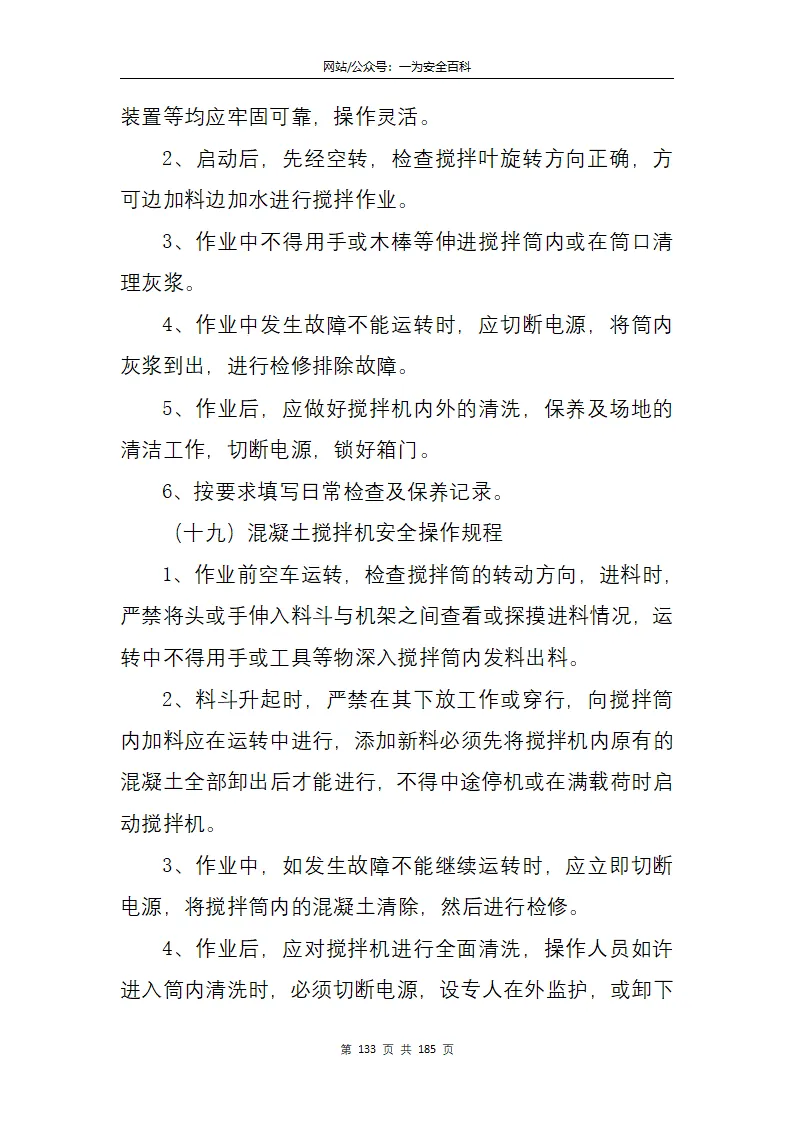 提供了详尽的工种和机械操作安全规程,涵盖电焊工、架子工、混凝土工、钢筋工等常见工种,以及搅拌机、起重机、挖掘机、装载机、钻机等各类施工机械的操作规范,强调持证上岗、劳保佩戴及设备检查。